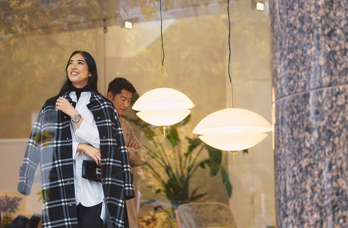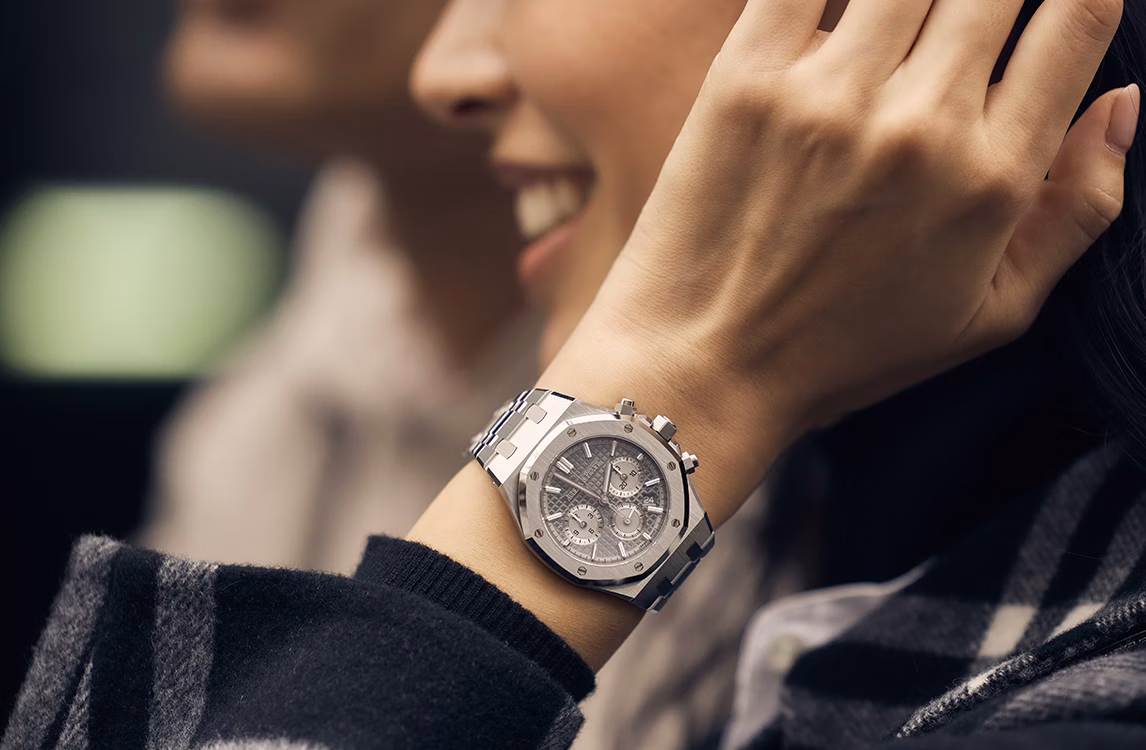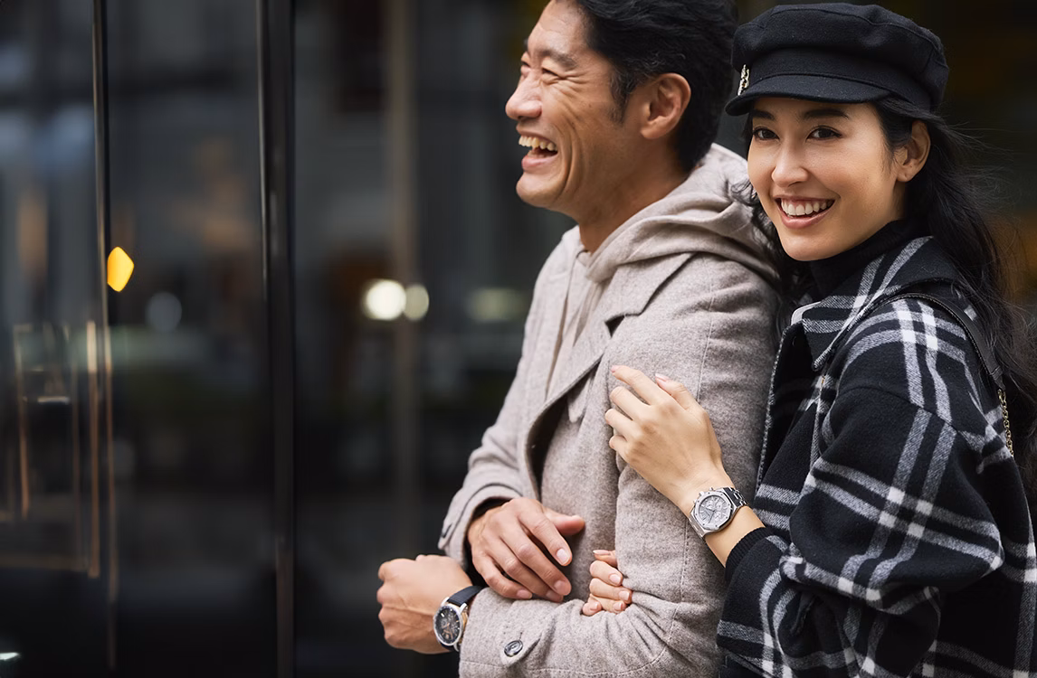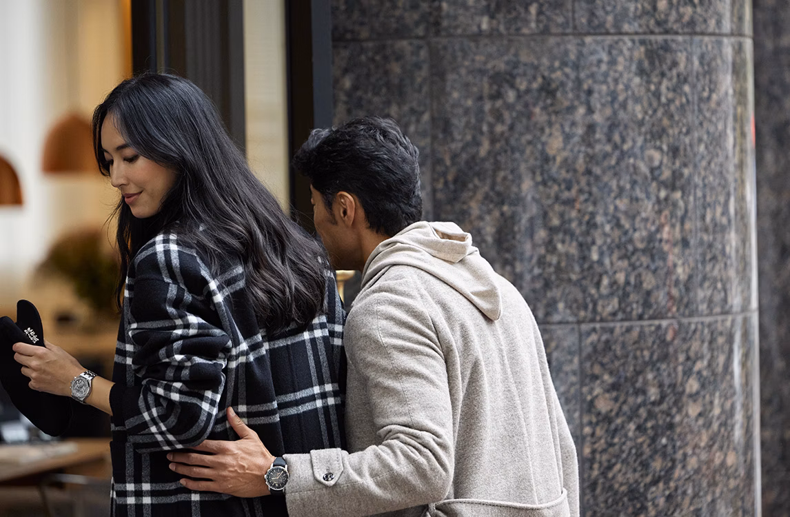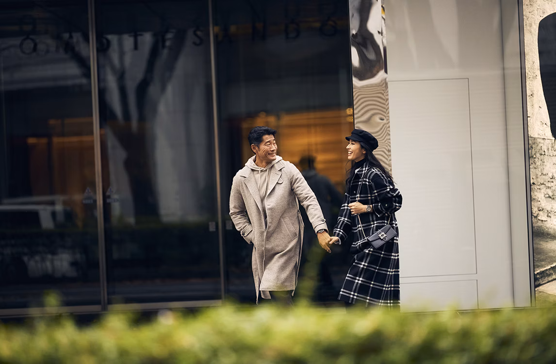 寒々とした冬空に最愛のパートナーに寄り添って——誕生50周年を迎えた「ロイヤル オーク」の新作コレクションを腕元に、幸せの温もり溢れる上品な装いで、ふたりの時間を満喫して。
