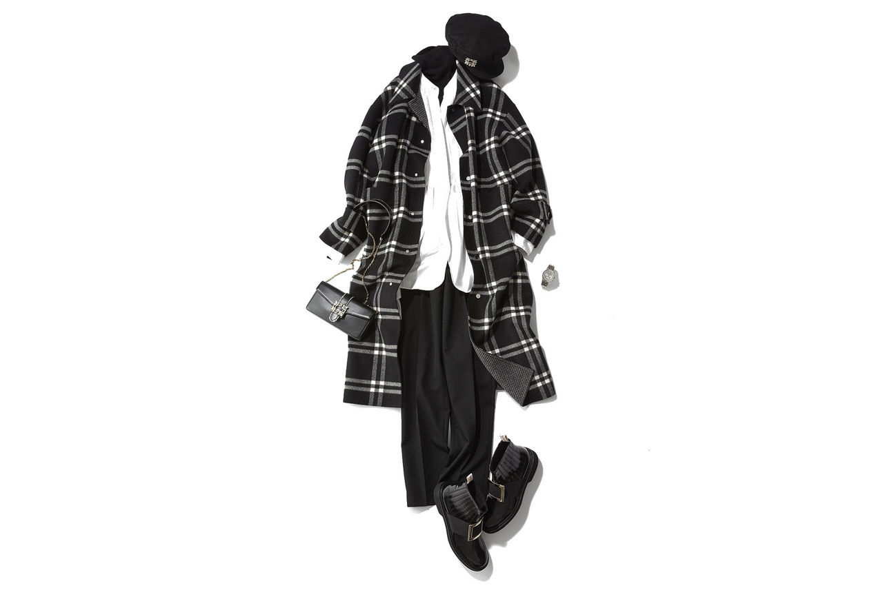 <女性>コート¥176,000、シャツ¥35,200、タートルネック¥12,100、パンツ¥35,200/すべてデパリエ(デパリエ ニュウマン 新宿店 TEL:03-6380-5541)、キャップ¥83,600/ロジェ・ヴィヴィエ、バッグ¥204,600 /ブロッシュ ヴィヴィエ、シューズ¥168,300/ヴィヴ レンジャー(すべてロジェ・ヴィヴィエ・ジャパン TEL:0120-957-940)