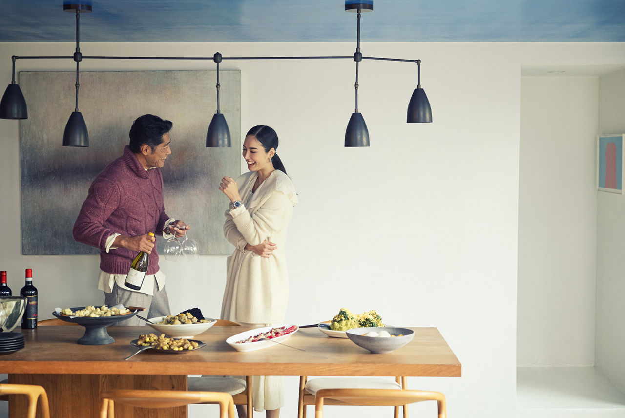 親しい友人たちを招待してホームパーティを開催。センス溢れる食器に盛り付けられた、おもてなし料理の数々。準備をする腕元で、さり気なく輝く腕時計は、ベセルにダイヤモンドがセットされた「ロイヤル オーク」。華やかな襟が素敵なワンピースに、ゆったりシルエットのカーディガンを羽織り、リラックスした装いのなかにも品格と優雅さを纏って。