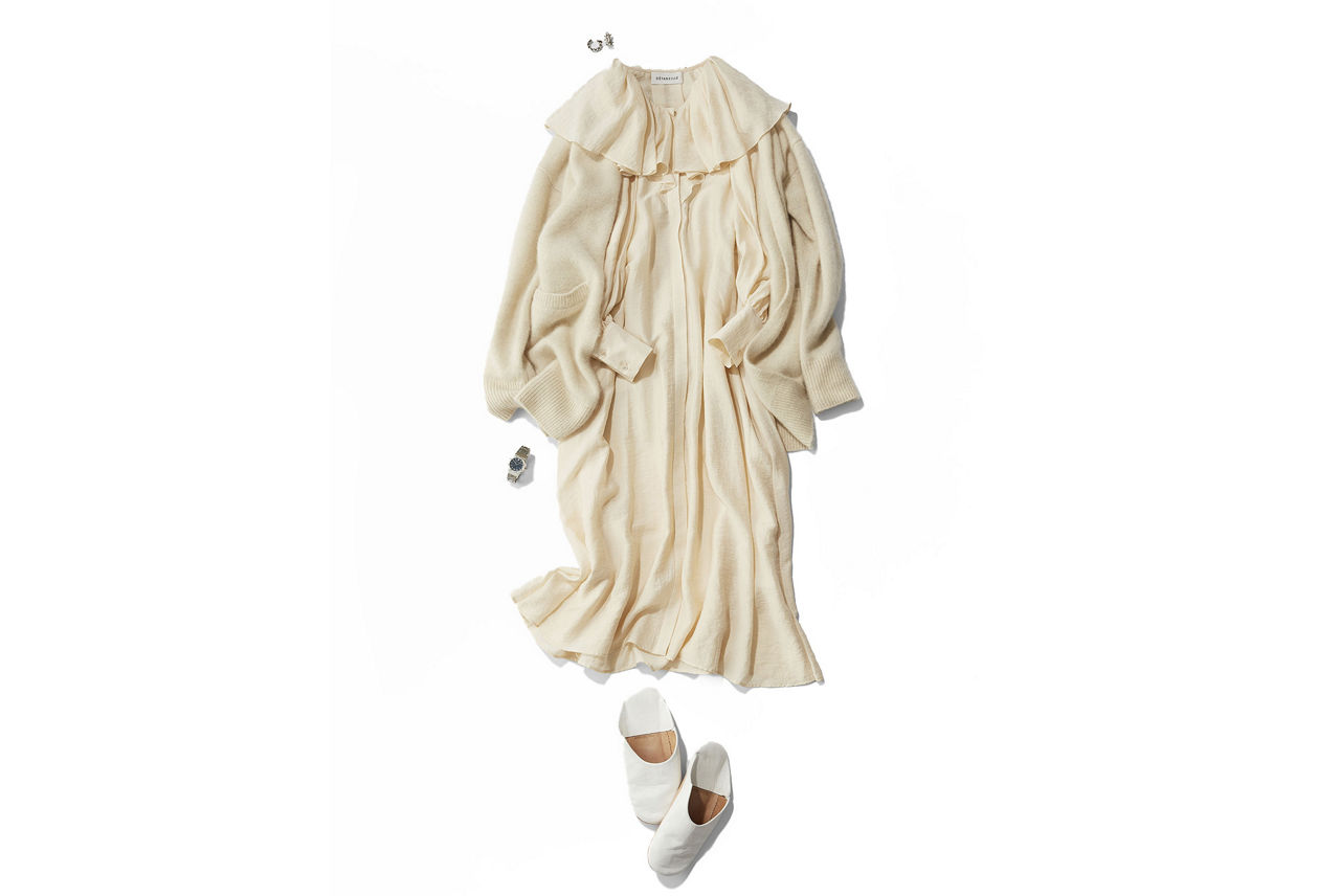 <女性>ワンピース¥46,200、カーディガン¥46,200/ともにデパリエ(デパリエ ニュウマン 新宿店 TEL:03-6380-5541)、ピアス¥14,500(ジェンマ アルス TEL:03-6438-0178)、シューズ/スタイリスト私物