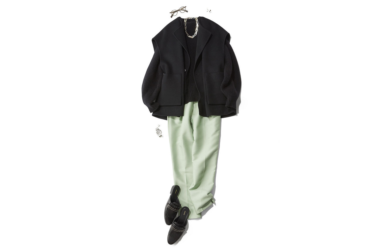 <女性>ニット¥77,000、パンツ¥63,800/ともにストラスブルゴ(ストラスブルゴ カスタマーセンター TEL:0120-383-563)、ジレ¥88,000(デパリエ ニュウマン 新宿店 TEL:03-6380-5541)、メガネ¥64,900/アイヴァン 7285(アイヴァン 7285 トウキョウ TEL:03-3409-7285)、ピアス¥49,500、ネックレス¥470,800、リング¥63,800(すべてホアキン・べラオ TEL:03-6821-7772)、シューズ/スタイリスト私物