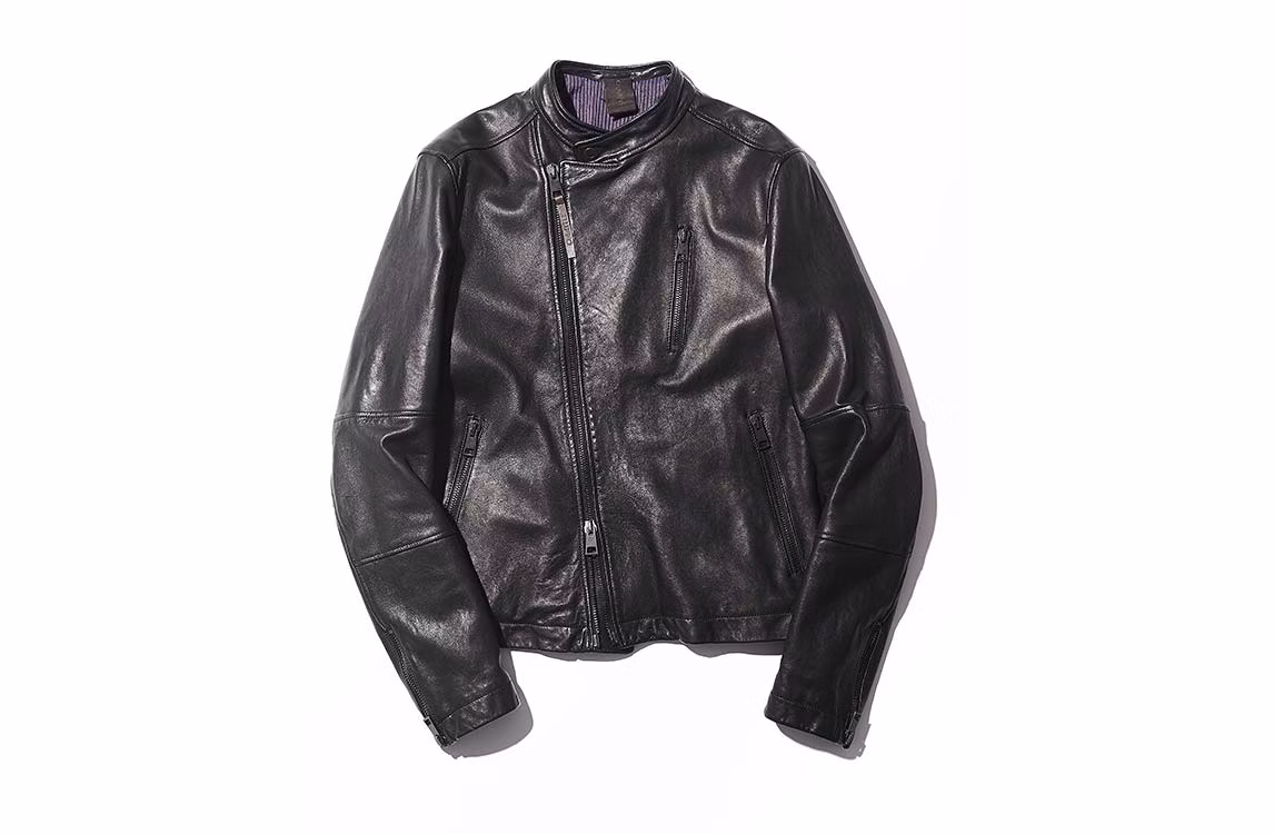 ハードな印象が強いレザーも、イタリア生まれのシンプルなライダースジャケットをチョイスして、マイルドな装いに。グレースラックスと合わせれば、男らしく上品なスタイルへと格上げしてくれる。腕元に着用したパープルのCODE 11.59と同色のレンズのサングラスが、大人らしい色気を醸し出す。