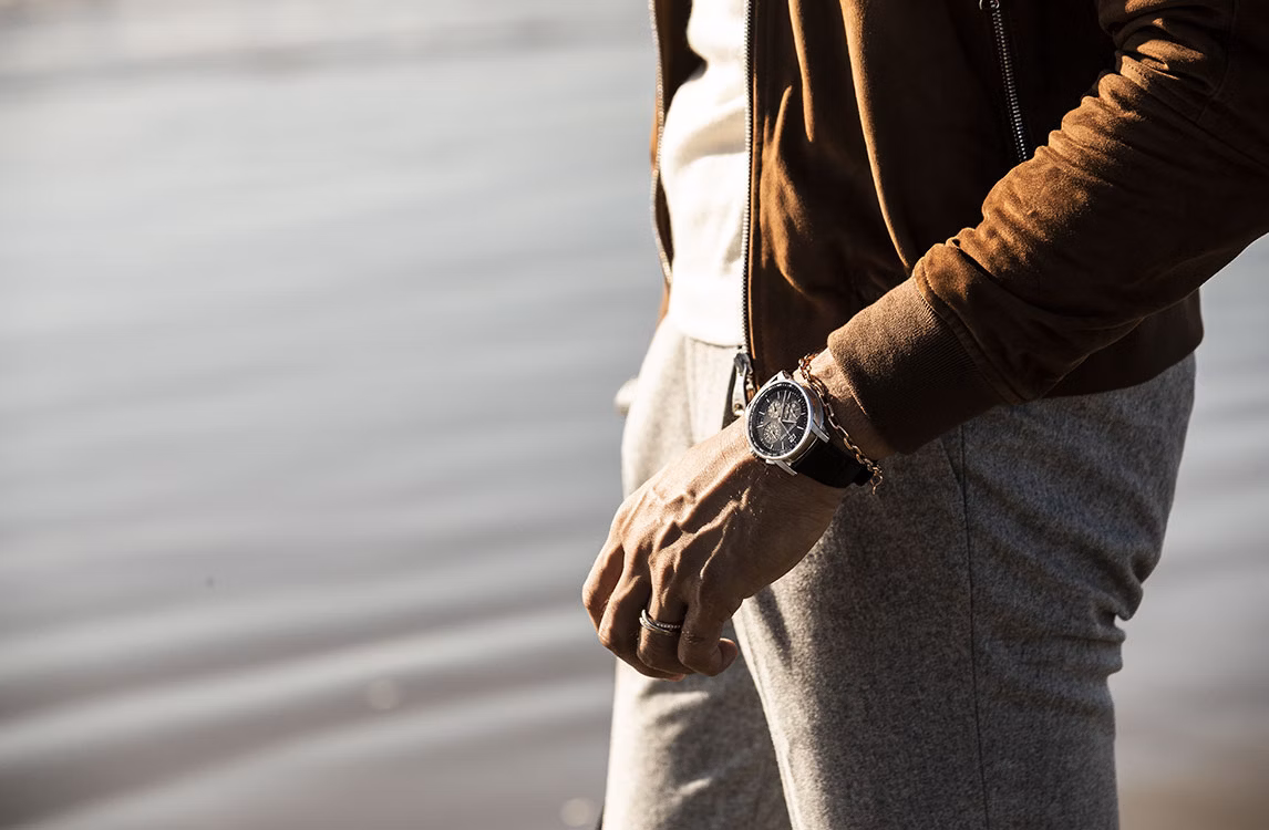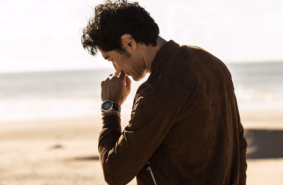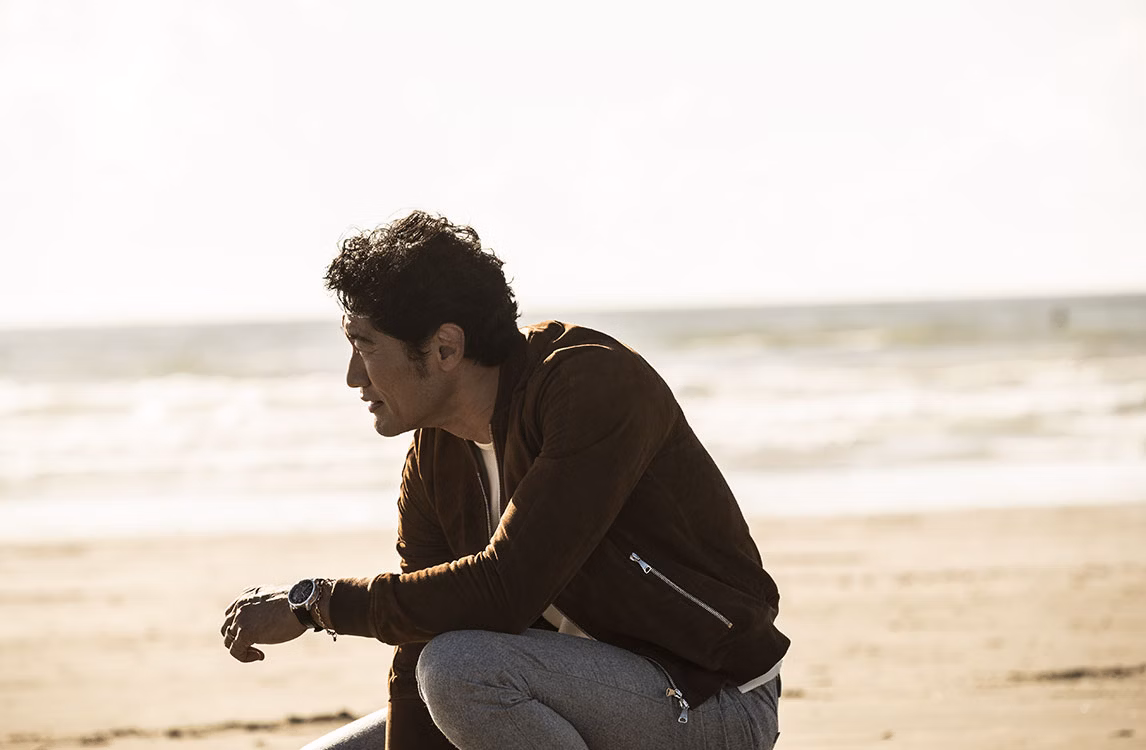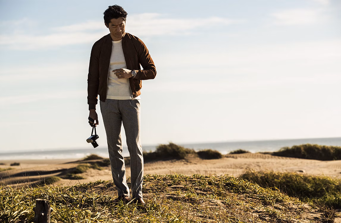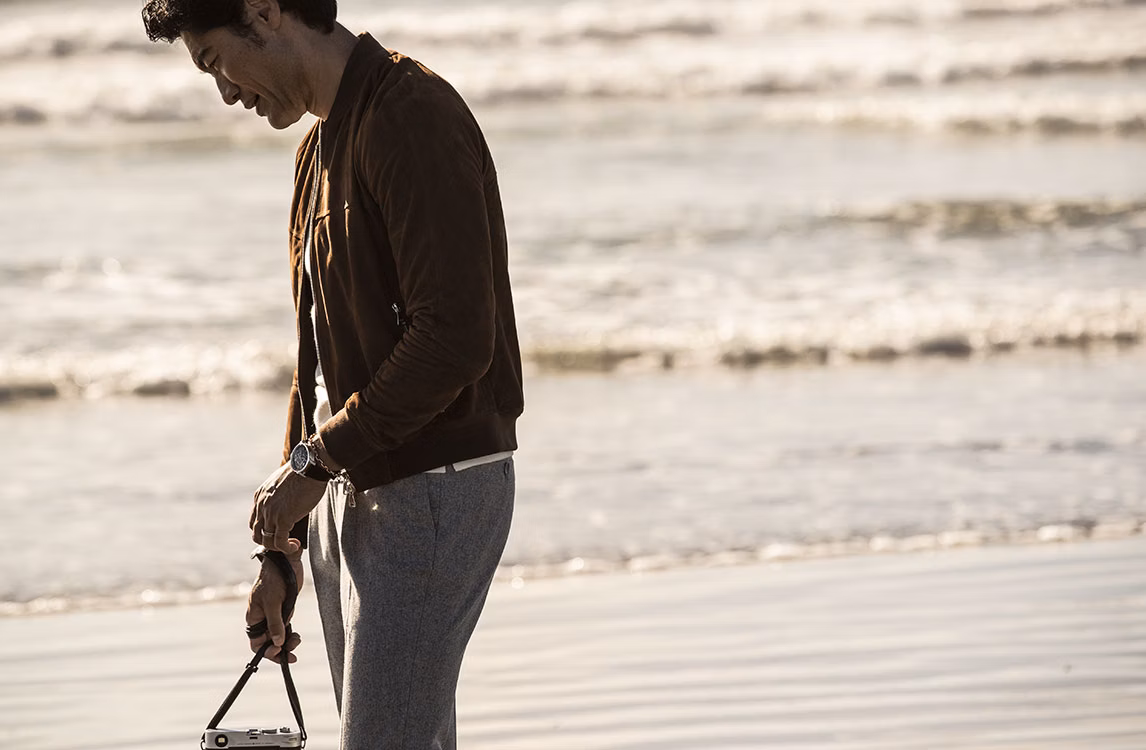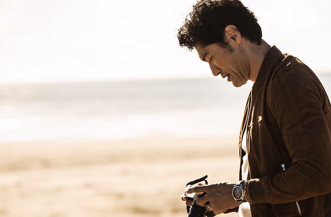 まるで目を輝かせた少年のように、趣味に没頭する姿は、大人になっても変わらない。白のニットにスエードのレザーブルゾンを羽織り、ひとり海辺を散歩する。長年愛用のカメラを握りしめた腕元で、チェーンブレスレットと一緒に燦々と輝くのはCODE 11.59だ。朝・夕で表情を変える海辺の空模様のように、陽の当たり具合で色調が変化するダイヤルが、優しく存在感を示す。
