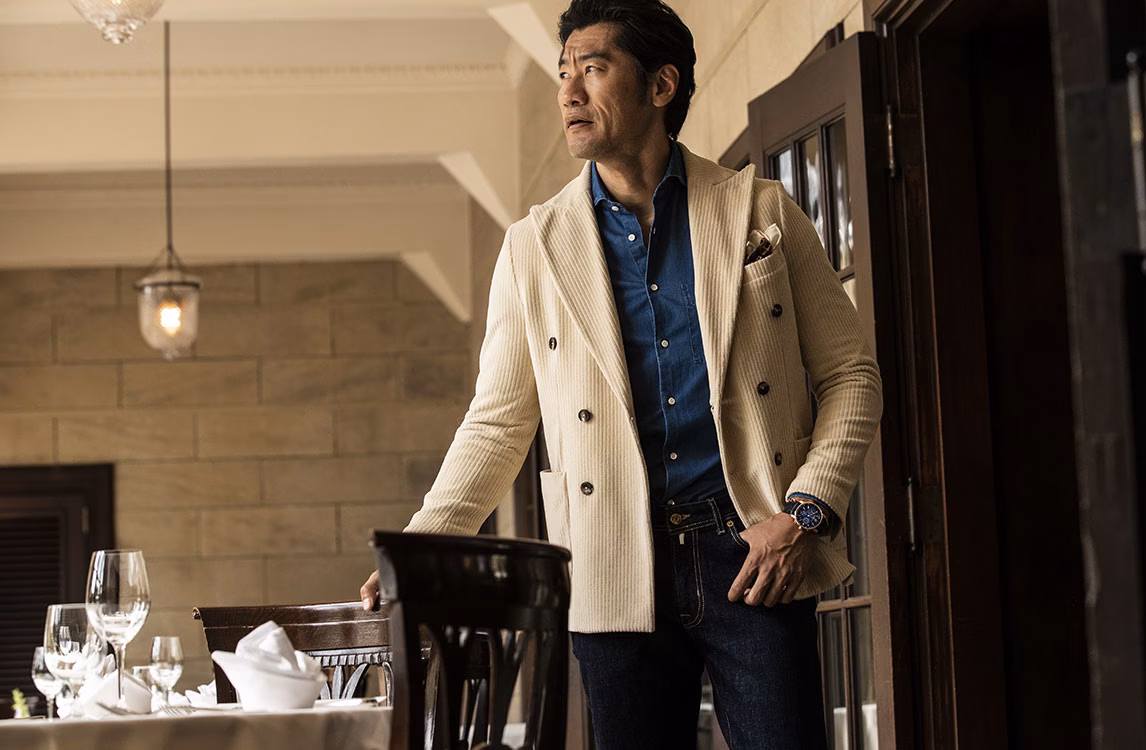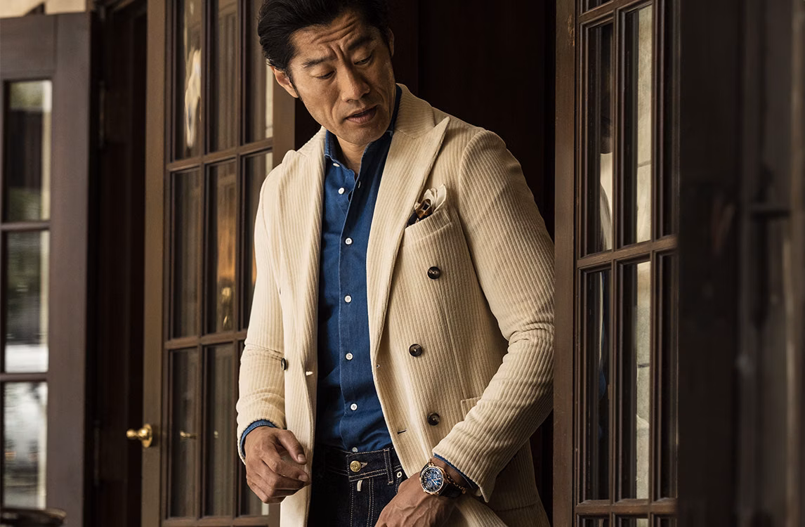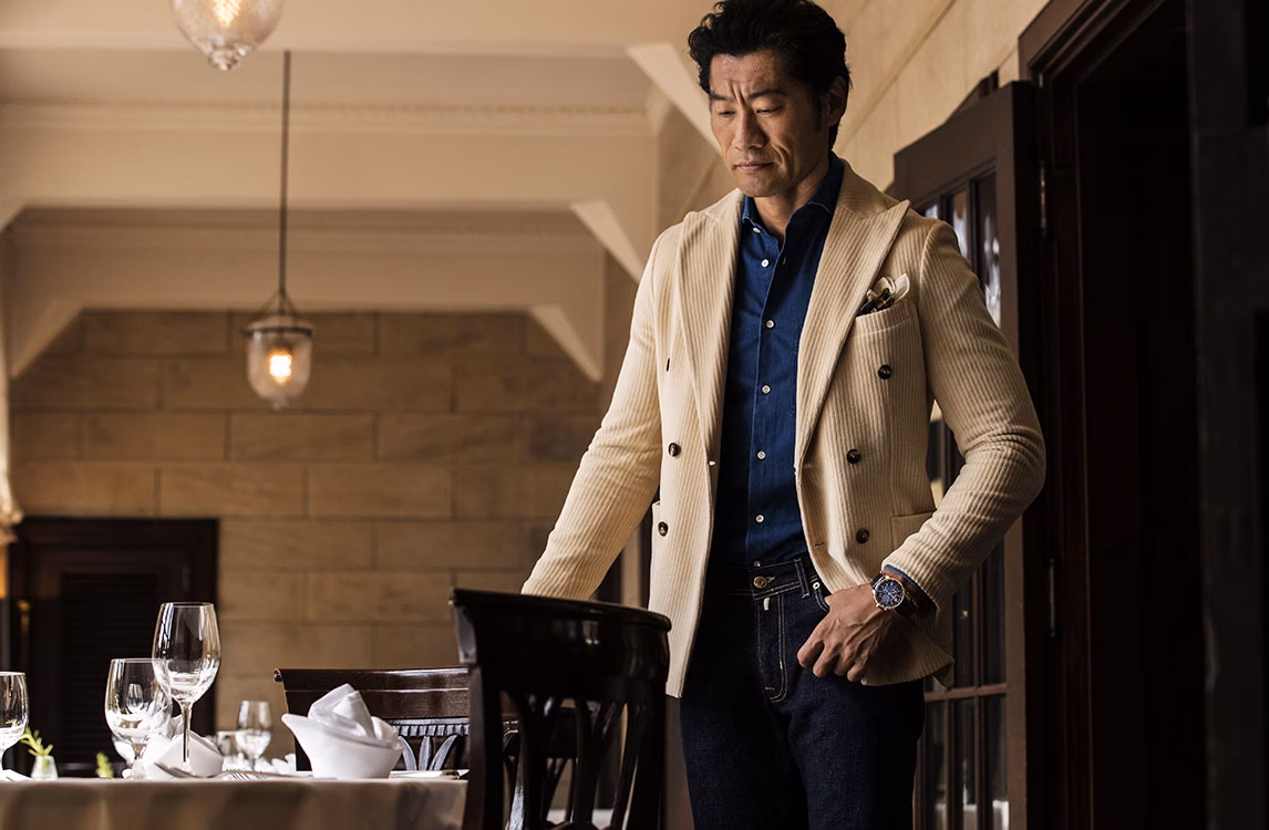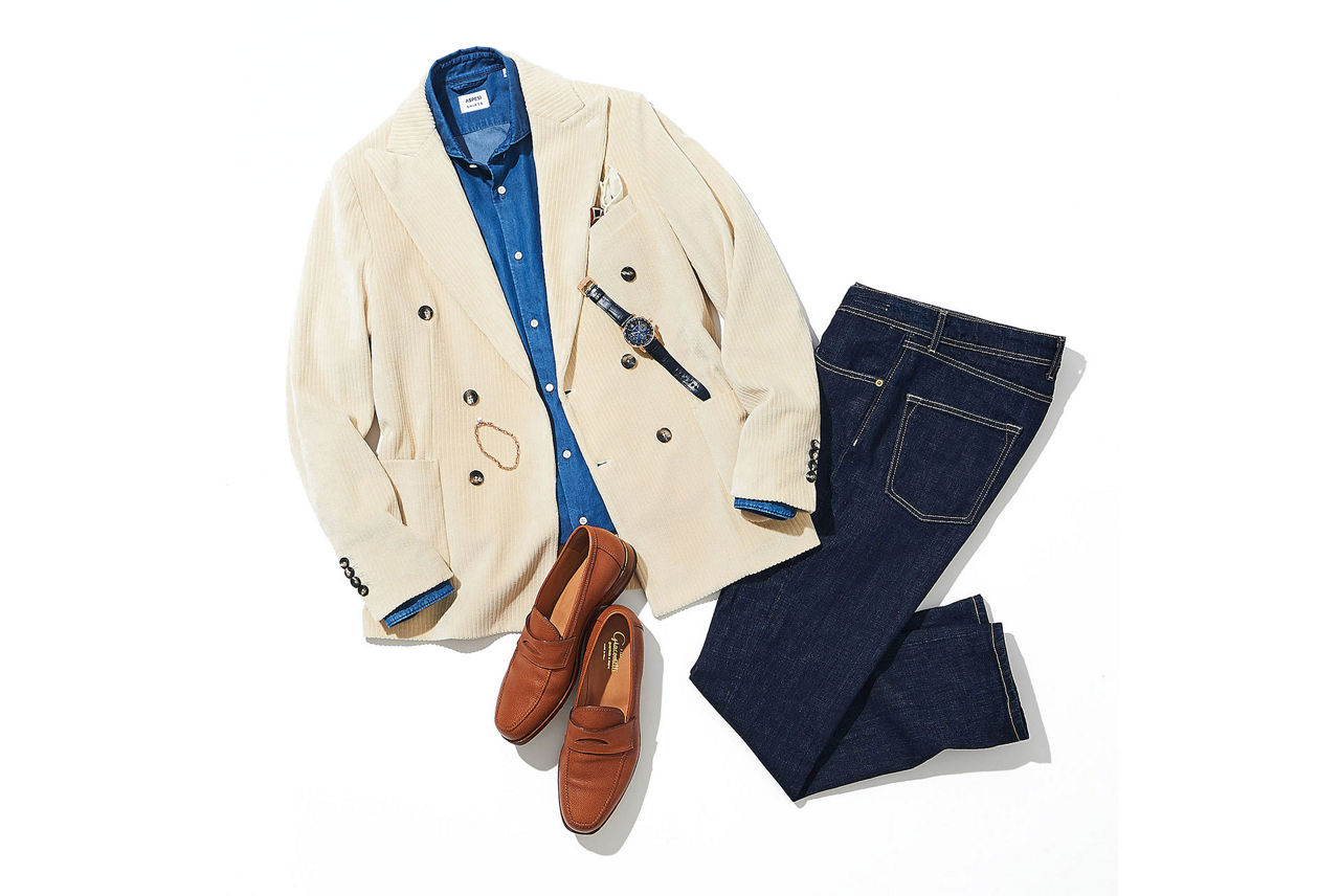 大切なビジネスパートナーとのランチ会食でも、 “キメすぎ”は少々気疲れしてしまう。程よくドレッシー、程よくカジュアルな、バランス感が大事。オフホワイトでコーデュロイ素材の旬なダブルジャケットを、シャンブレーシャツとデニムでドレスダウン。濃淡のあるブルーダイヤルのCODE 11.59が、コーディネート全体の色味のバランスをとる。
