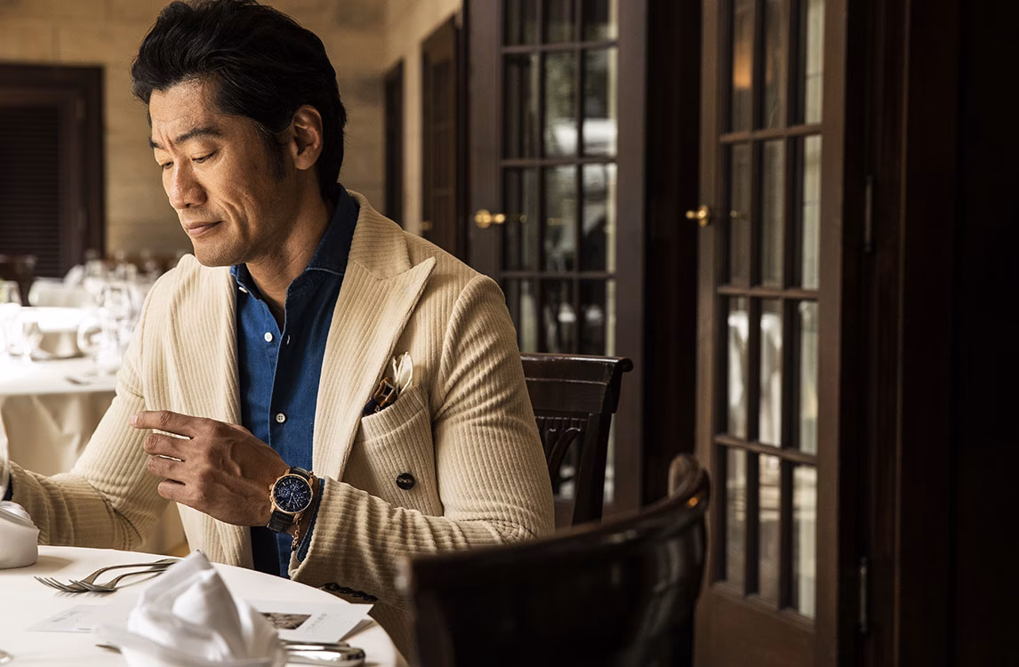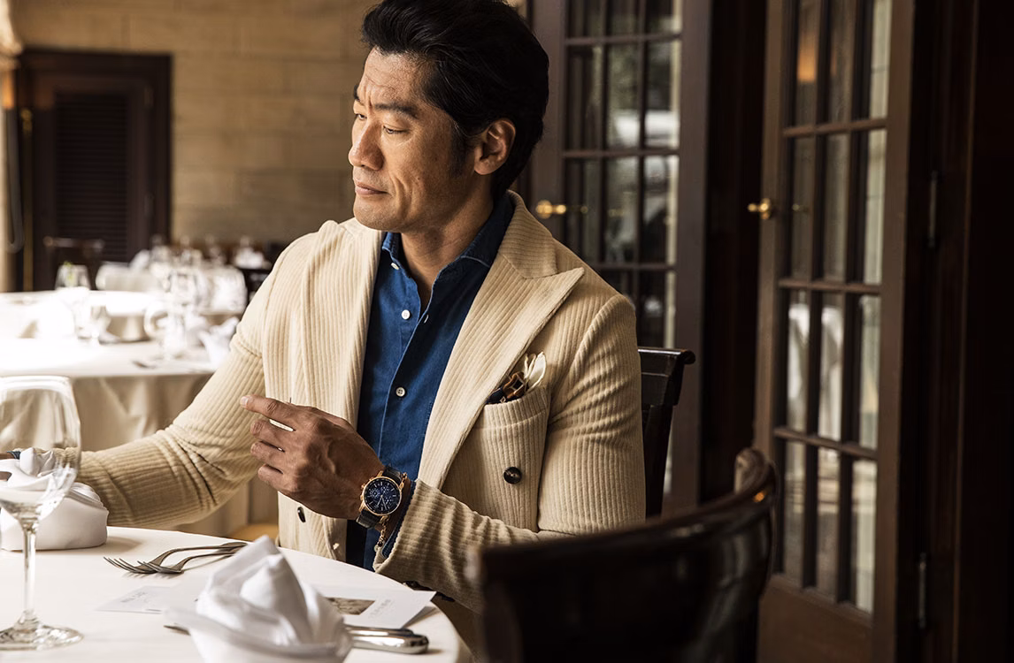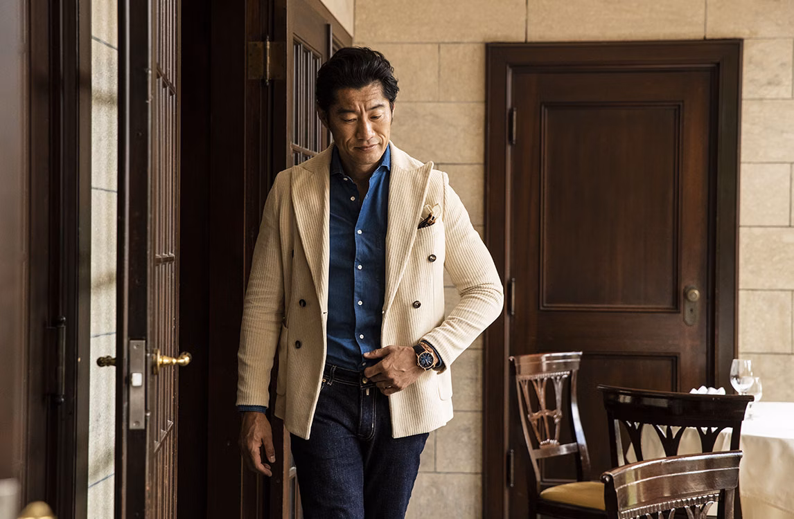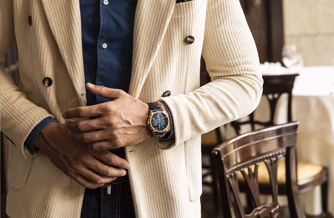 大切なビジネスパートナーとのランチ会食でも、 “キメすぎ”は少々気疲れしてしまう。程よくドレッシー、程よくカジュアルな、バランス感が大事。オフホワイトでコーデュロイ素材の旬なダブルジャケットを、シャンブレーシャツとデニムでドレスダウン。濃淡のあるブルーダイヤルのCODE 11.59が、コーディネート全体の色味のバランスをとる。