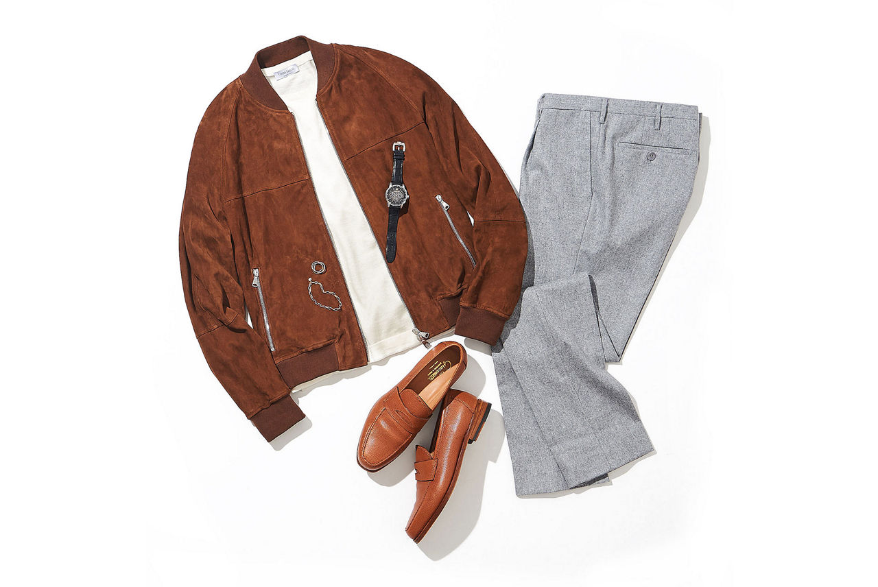 ブルゾン¥ 120,000/エンメティ、ニット¥ 22,000/グランサッソ、パンツ¥ 62,000/ロータ(すべてビームス 六本木ヒルズ TEL:03-5775-1623)、ローファー¥ 98,000/フラテッリ ジャコメッティ(ウィリー TEL:03-5458-7200)、リング¥ 300,000、ブレスレット¥ 440,000/ともにスーマン・ダックワ(S.O.S fp 恵比寿本店 TEL:03-3461-4875)