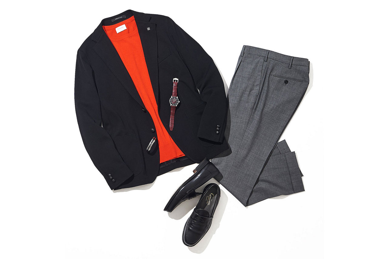 溜まっていたデスクワークを自宅のワークスペースで片付ける。そんな日は、遊び心をプラスした「テレワーク」スタイルで。ブラック×グレーという落ち着いた配色のジャケパンコーディネイトを、鮮やかなオレンジニットでフレッシュな装いに。腕に着けたバーガンディのCODE 11.59が、大人らしい色気を演出してくれる。