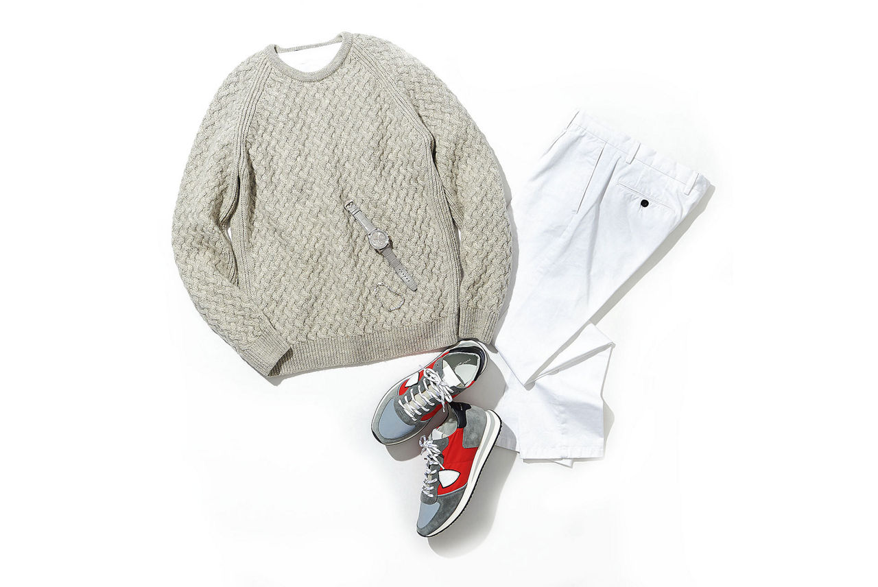 部屋のベッドに横たわりながら、ぼんやりと写真集を眺める。そんな時間に追われない休日には、リラックス感のあるローゲージニットをチョイス。ホワイトパンツとスニーカーを合わせて、上品なカジュアルコーディネイトに。腕には淡いグレーのCODE 11.59を着用。全体をペールトーンでまとめることで、男らしいクリーンな雰囲気を醸し出してくれる。