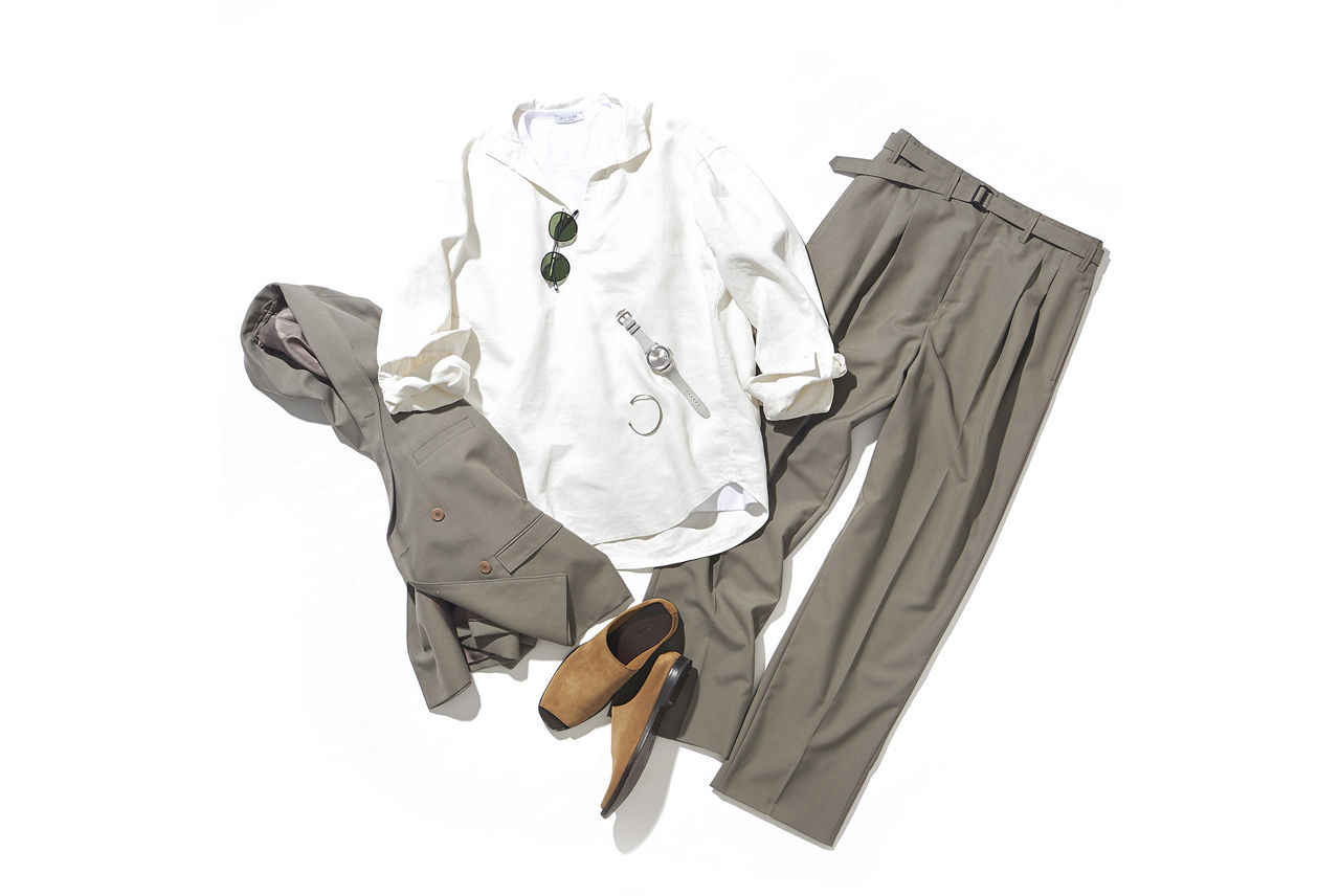 ジャケット¥106,700、スラックス¥73,700、サンダル¥73,700/すべてルメール(スクワット/ルメール TEL:03-6384-0237)、シャツ¥55,000/ブリエンヌ パリ(エストネーション TEL:0120-503-971)、Tシャツ¥9,790/アンティチポ(ナノ・ユニバース カスタマーサービス TEL:0120-705-088)、サングラス¥42,900/アイヴァン(アイヴァン 東京ギャラリー TEL:03-3406-1972)、バングル¥19,800/アダワット トゥアレグ(アダワット トゥアレグ TEL:050-5218-3859)※腕時計はグレーのラバーストラップに付け替え
