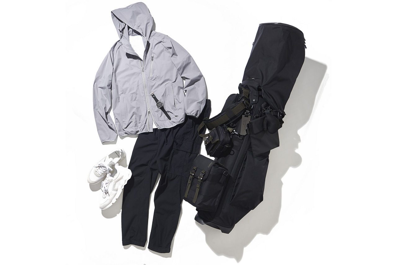 パーカ¥47,300、ゴルフバッグ¥217,800/ともにバッグ ジャック ゴルフ(Feel Glad TEL:03-6804-1183)、Tシャツ[2枚セット]¥16,500/スリードッツ(スリードッツ青山店 TEL:03-6805-1704)、パンツ¥39,600/ジェームス パース(ジェームス パース 青山店TEL:03-6418-0928)、スニーカー¥81,400/ピエール アルディ(ピエール アルディ 東京 TEL:03-6712-6809)