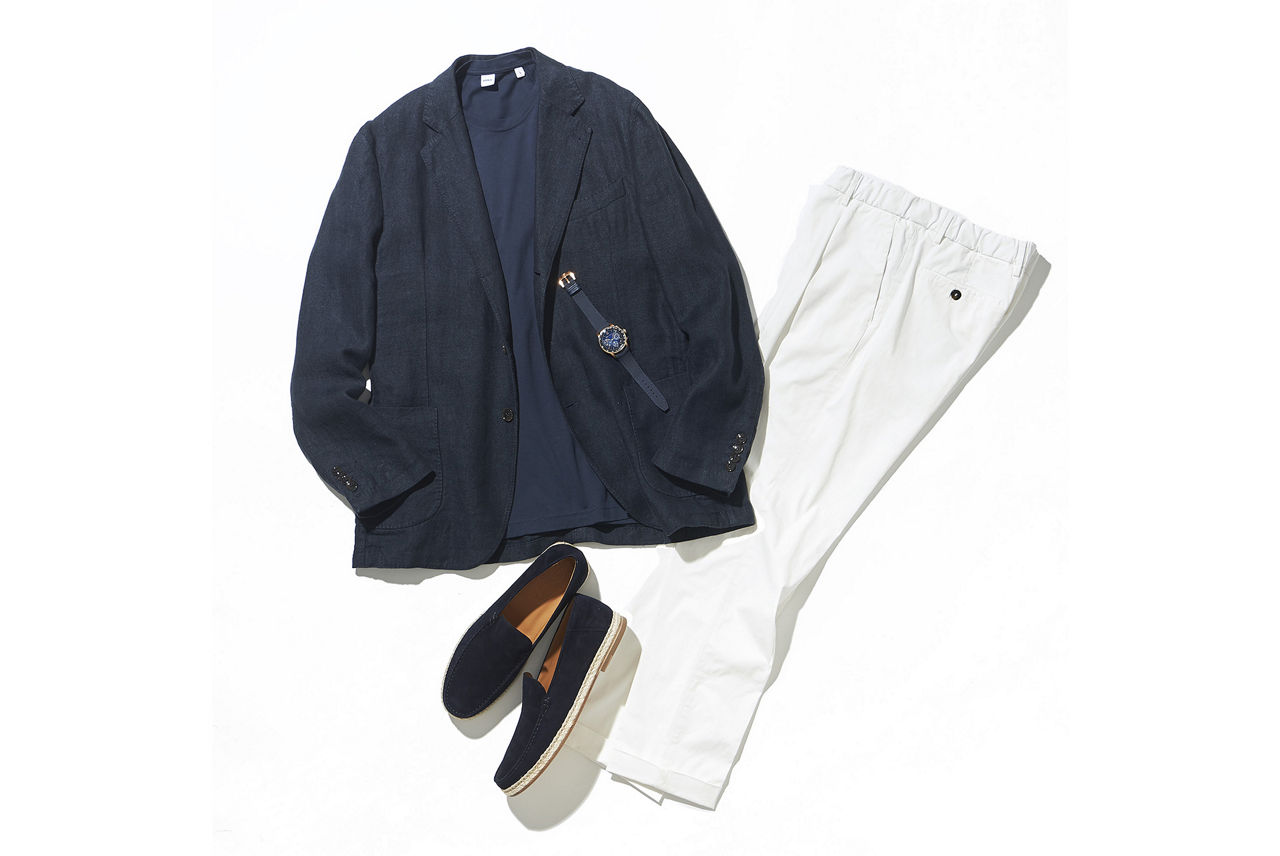 ジャケット¥83,600/マン 1924(ジュンカスタマーセンター TEL:0120-298-133)、Tシャツ¥12,100/アスペジ、パンツ¥25,300/ブリリア 1949(ともにトヨダトレーディング プレスルーム TEL:03-5350-5567)、シューズ¥81,400/ジェイエムウエストン(ジェイエムウエストン 青山店 TEL:03-6805-1691)
