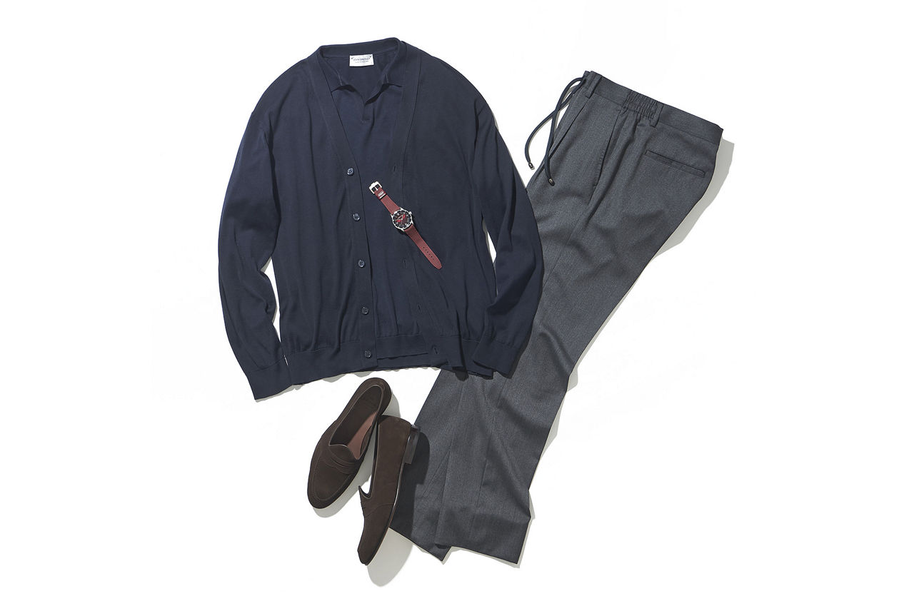 カーディガン¥38,500、Tシャツ¥28,600/ジョン スメドレー(リーミルズ エージェンシー TEL:03-5784-1238)、パンツ¥30,800/リングヂャケット × エストネーション(エストネーション TEL:0120-503-971)、シューズ57,200/カルミーナ(トレーディングポスト青山本店 TEL:03-5474-8725)※腕時計はバーガンディのラバーストラップに付け替え