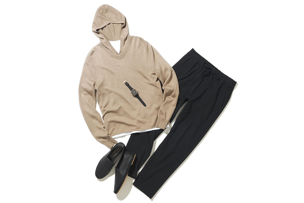 パーカ¥48,400/アスペジ(トヨダトレーディング プレスルーム TEL:03-5350-5567)、パックT2枚組み¥16,500/スリードッツ(スリードッツ青山店 TEL:03-6805-1704)、パンツ¥23,100/ラグ & ボーン(rag & bone 表参道店 TEL:03-6805-1630)、シューズ¥75,900/セルジオ ロッシ(セルジオ ロッシ カスタマーサービス TEL:0570-016600)