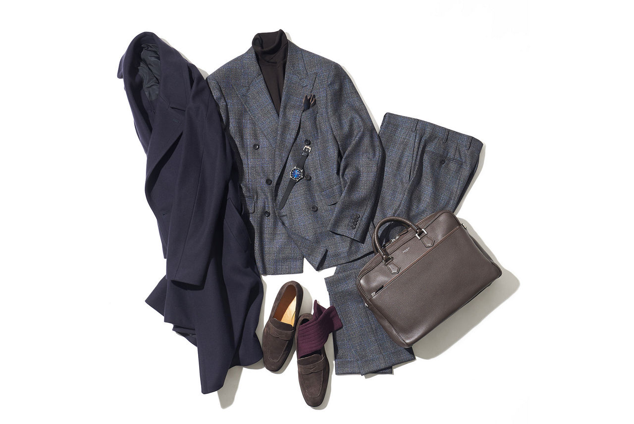 文字盤のカラーにリンクさせて、ブルー×茶でまとめた“アズーロ・エ・マネーロ”の王道コーデ。スーツのチェックのブルーを拾い、コートもネイビーに。ニットのほか、ローファー、ブリーフケース、チーフもブラウン系に。配色の妙が光るスーツスタイル。