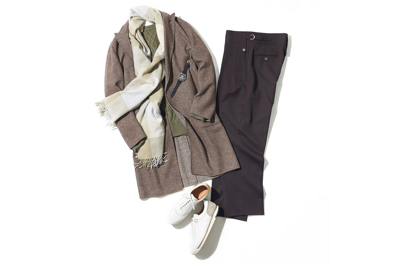 軽快な着心地のロングコートにカシミアのニットとストールを組み合わせて、リラックス感を演出。クロノグラフのスポーティさと呼応するように、足元はレザーシューズではなくスニーカーをチョイス。エレガントなカジュアルスタイルが完成する。
