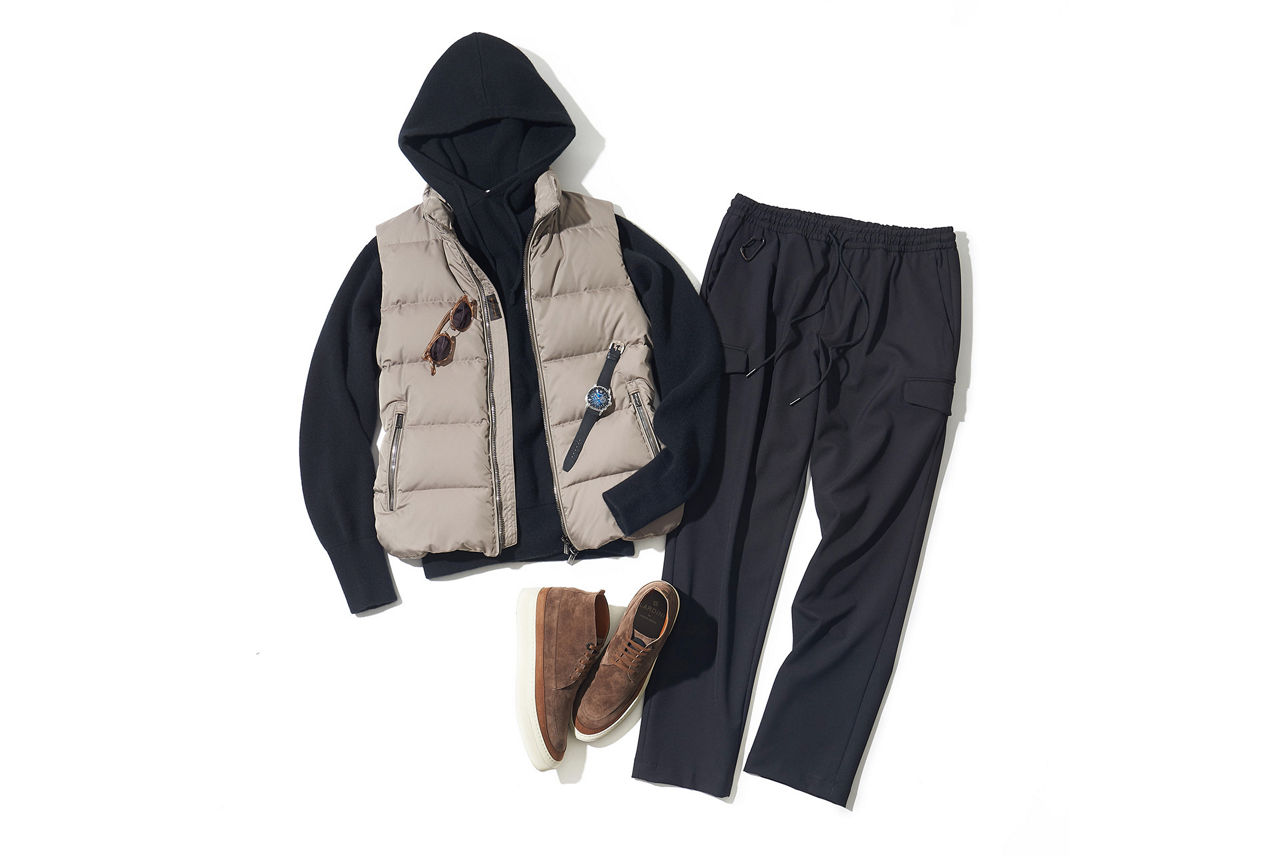 ダウンベスト以外はトップスとボトムスを黒でまとめたシンプルコーデ。カシミアなど上質な素材を取り入れることで、見た目はカジュアルながらラグジュアリーな着こなしに。全体のコーディネイトで色数を抑えた分、挿し色としてブルーダイヤルを腕元に。