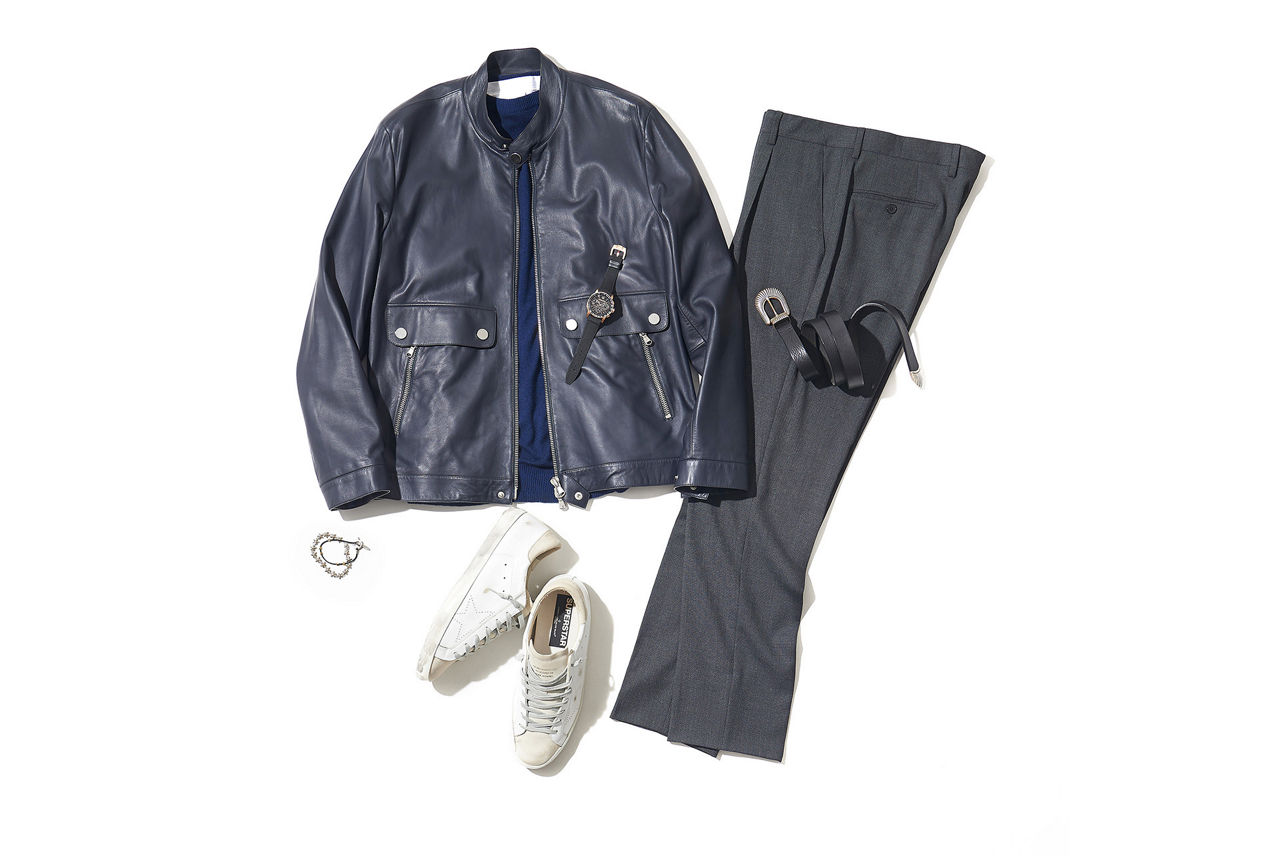 レザージャケット¥165,000/エストネーション(エストネーション TEL:0120-503-971)、ニット¥99,000/ヤコブ コーエン(ヤコブ コーエン 東京ミッドタウン店 TEL:03-3405-0852)、スラックス(スーツ)¥163,900/ラルディーニ(トヨダトレーディング プレスルーム TEL:03-5350-5567)、シューズ¥62,700/ゴールデン グース(ゴールデン グース 東京店 TEL:03-6803-8272)、シルバーのブレスレッド¥39,600/エンド(ギャラリー・オブ・オーセンティック TEL:03-5808-7515)、ブレスレッド¥85,800/ジルプラットナー(アルファ PR TEL:03-5413-3546)、ベルト/スタイリスト私物