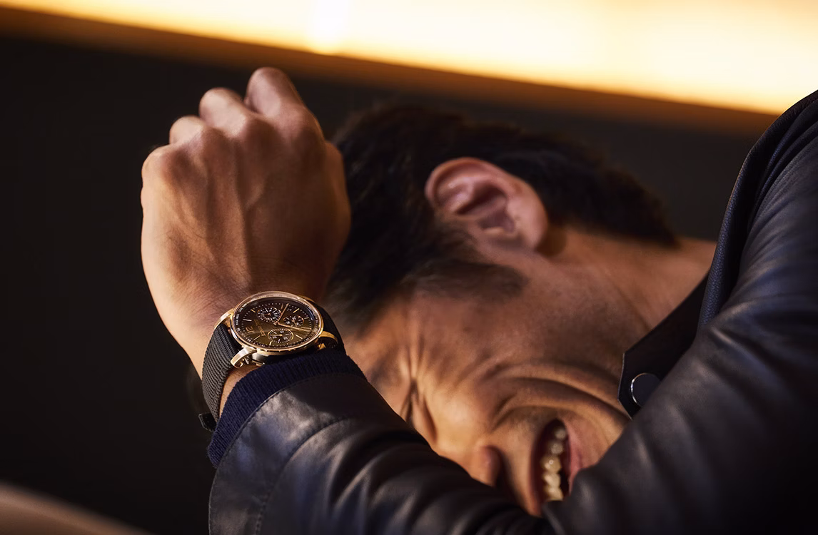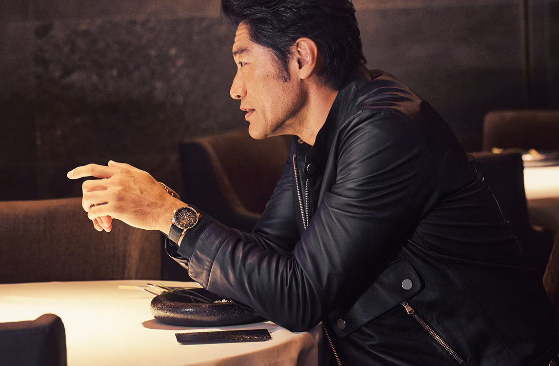 以心伝心の仲、心から通じ合うパートナーとひさしぶりにレストランバーへ。品のあるスラックスにあえてレザージャケットを合わせ、キメすぎず、ユルすぎない、大人の余裕と貫禄を感じさせるスタイルに。18Kピンクゴールド×ブラックセラミックの異素材コンビの腕時計が、男らしい色気を醸し出す。何気ない会話で盛り上がる、そんなふたりきりの特別な時間をCODE 11.59と刻む。