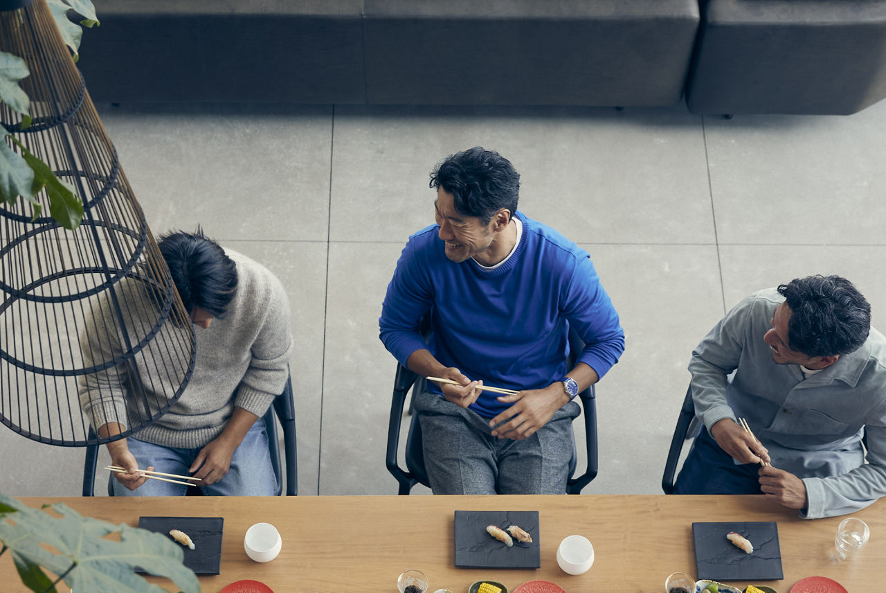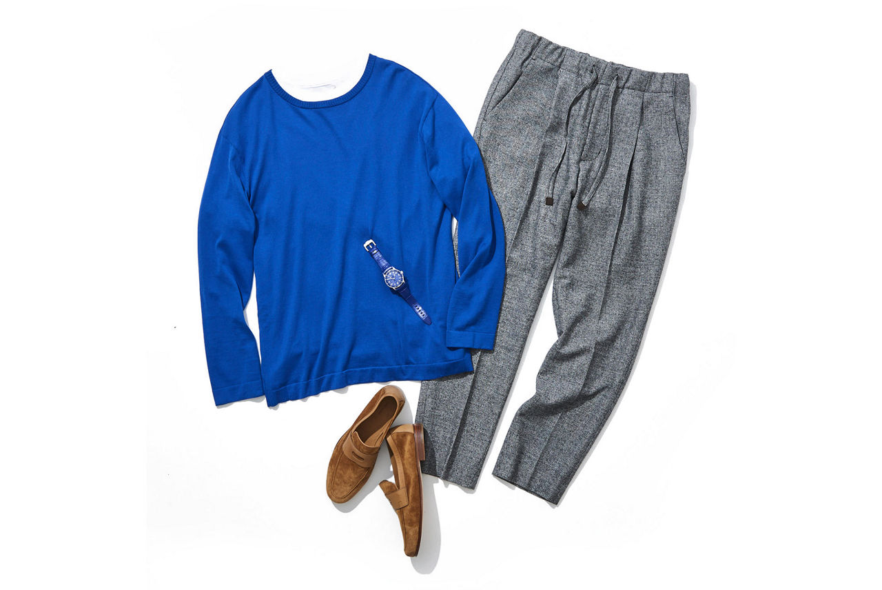 週末に部下たちを郊外の別荘へ招待し、腕利きの職人を呼んでの高級寿司パーティ。三崎港で水揚げされた本マグロ、とろけるような最高級の生ウニ——極上の握りに舌鼓する“口福”なひと時には、リラックスモード全開の爽やかなブルーニットとイージーパンツで。色艶やかなソーダライトのCODE 11.59ともあいまって、エグゼクティブらしい余裕を感じさせる。