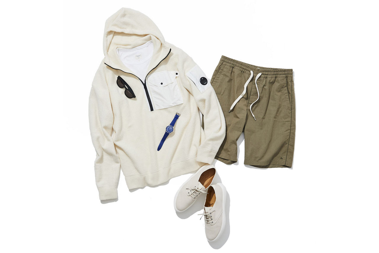 インナーのTシャツ¥9,900、ショーツ¥33,000/ともにラグ & ボーン(ラグ & ボーン 表参道店 TEL:03-6805-1630)、シューズ¥71,500/ジェイエムウエストン(ジェイエムウエストン 青山店 TEL:03-6805-1691)、パーカ、サングラス/スタイリスト私物