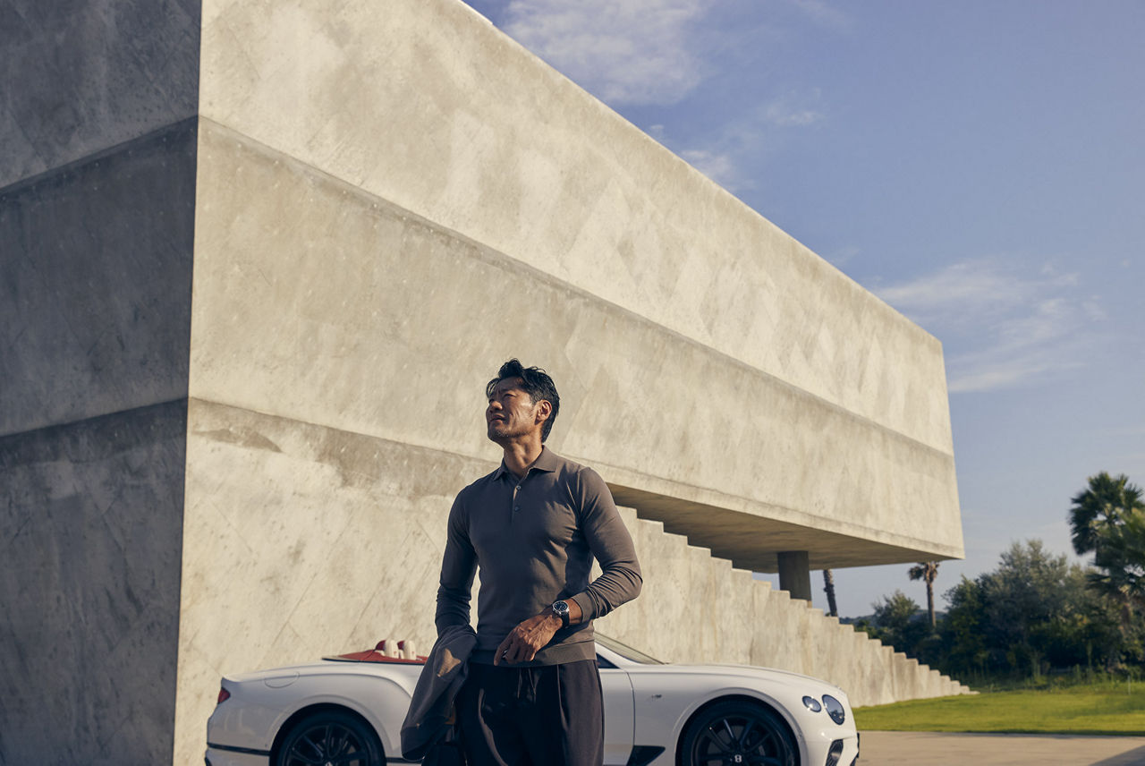 夏の猛暑もかげりをみせ、心地よい季節に。そんな秋日和な休日は、ニットポロシャツにブルゾンを纏い、イージースラックスをはいてドライブへ。渋い色味でまとめたスタイルにオニキスダイヤルのCODE 11.59が大人らしい貫禄を与えてくれる。オープンカーで爽快に駆け抜け、腕元でさり気なく輝くダイヤモンドが高揚感をもたらしてくれるはず。
