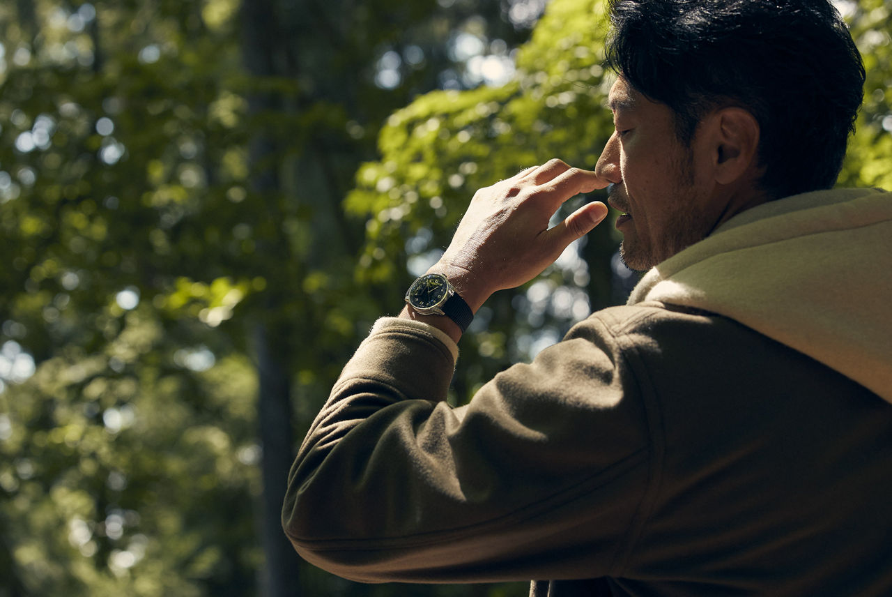 キャンプのベストシーズンが到来。野外でロックグラスを傾け、気兼ねない仲間との語らいは、何ごとにも代えがたい贅沢なひと時。保温性も抜群なウールパーカにカーキのフィールドコートを羽織り、上品なアウトドアスタイルに。ダイヤモンドがセットされたCODE 11.59は、ラバーストラップの効果もあり、カジュアルなスタイルにも絶妙にフィットする。