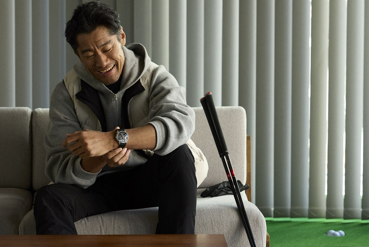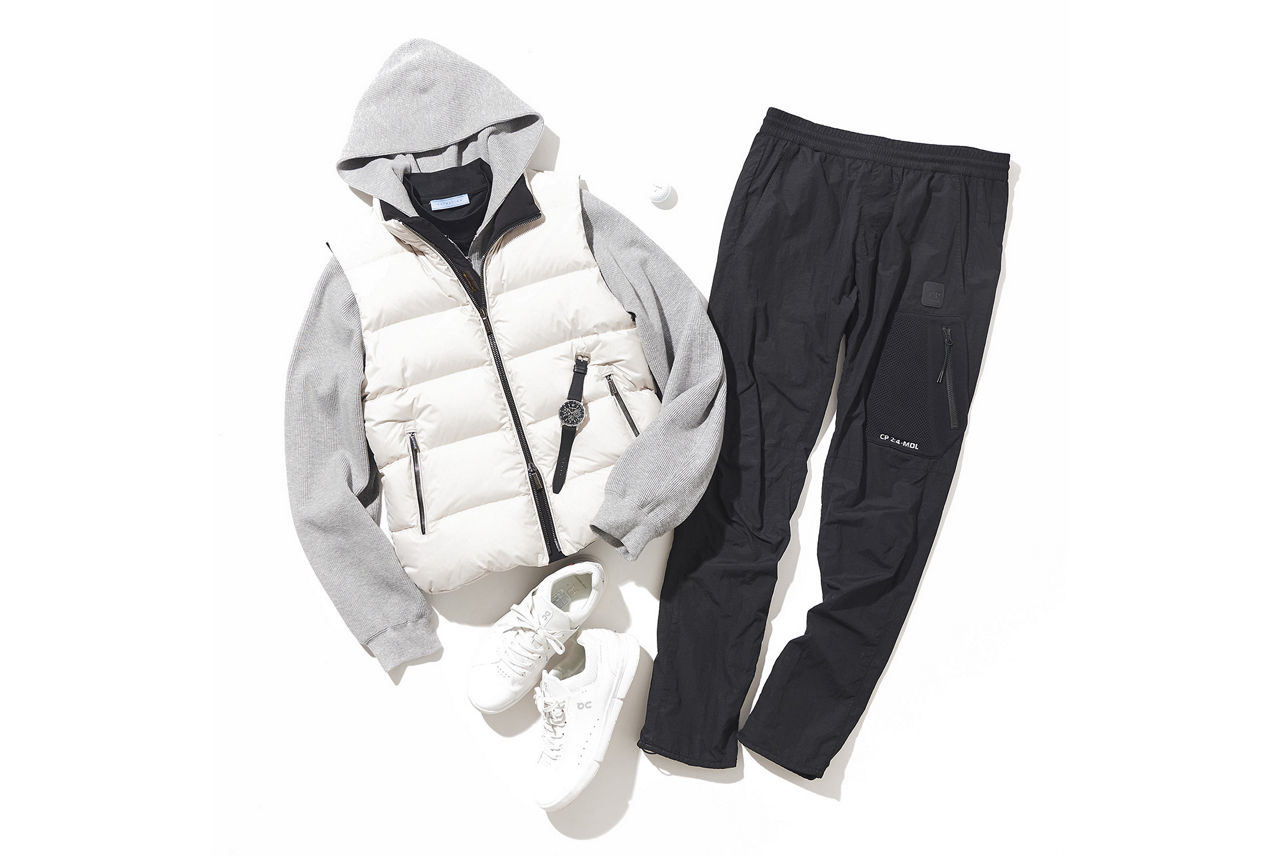年末年始に開催されるコンペに備えて、会員制のインドアゴルフクラブに足繁く通う。ゆったりとしたシルエットのパーカにラグジュアリーなダウンベストを合わせ、CODE 11.59のクロノグラフを腕元に。ブラックオニキスを使用した天然石ダイヤルとダイヤモンドのコンビがエレガント。ラバーストラップの効果でアクティブなスタイルにもフィットする。
