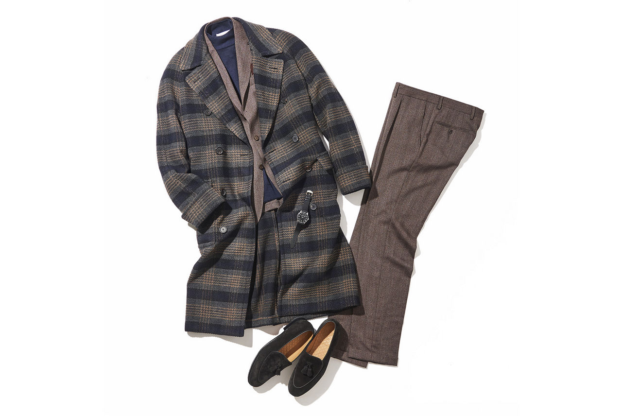 コート¥209,000、スーツ¥181,500、チーフ¥14,300/すべてラルディーニ、ニット¥31,900/フィリッポ デ ローレンティス(すべてトヨダトレーディング プレスルーム TEL:03-5350-5567)、シューズ¥242,000/ジョンロブ(ジョン ロブ ジャパン TEL:03-6267-6010)
