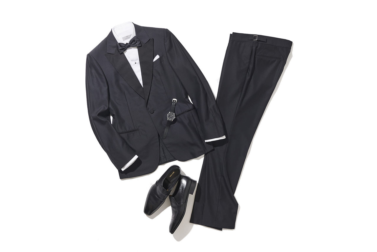 タキシード、ボウタイともに参考商品/ゼニア(ゼニア カスタマーサービス TEL:03-5114-5300)、シャツ参考商品/カナーリ(コロネット TEL:03-5216-6521)、シューズ¥315,700 /ジョンロブ(ジョン ロブ ジャパン TEL:03-6267-6010)、チーフ/スタイリスト私物