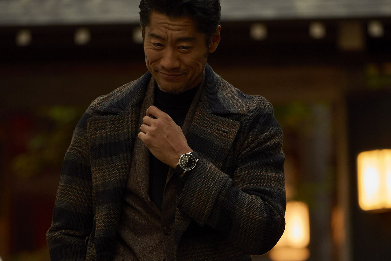年の瀬の会食に、旧知の仲のビジネスパートナーと和食店へ。渋い色味のブラウンのセットアップにチェックコートを纏い、大人らしく貫禄ある着こなしに。艶感のあるブラックオニキスダイヤルの「黒」のCODE 11.59が男らしい色気を醸し出す。会食を終えて、お店を後に石畳の上を颯爽と歩くその腕元で、CODE 11.59にセットされたダイヤモンドがさり気なく輝く。