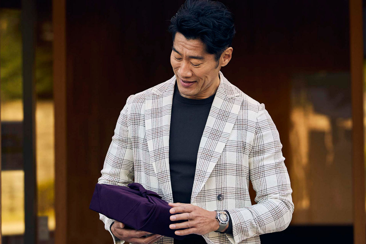取引先の新オフィスへ表敬訪問。その前に手土産を購入しようと、老舗の和菓子店に足を踏み入れる。定番から四季折々の逸品まで、彩り豊かな和菓子に心が和まされる。軽やかなリネン素材のジャケパンスタイルに、同系色のCODE 11.59の新作を腕元に身に着けて。春らしい装いで気分も一新、ビジネスパートナーのもとへ颯爽と向かう。