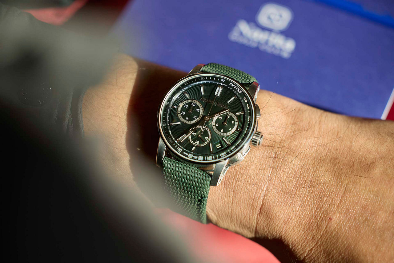 CODE 11.59では初となるステンレススティール素材のモデルが登場。スモークベージュ(写真左)やグリーン(写真右)など、絶妙にカラーを浮き立てるスタンプ加工が施されたダイヤルが特徴。スモークベージュのミドルケースの素材にはブラックセラミックを使用する。