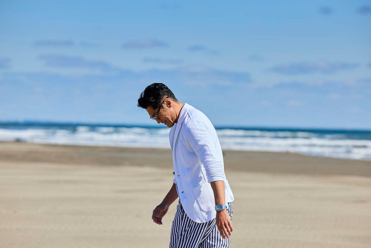 心地よい春の陽気に誘われて、ひとりビーチサイドへ。サンダルを脱ぎ捨てて、広大なビーチを歩き進む。リネンのジャケットにコットンシルクのニット、ストライプのイージーパンツでリラックスモード全開に。ライトブルーのラバーストラップを装着した「ロイヤル オーク オフショア クロノグラフ」が、どこまでも広がる青い海にフィットする。