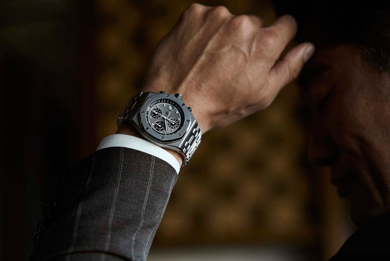 大切なビジネスの商談にラグジュアリーホテルのプライベートバーを活用。大人らしい貫禄を与えてくれるブラウンのスーツに身を包み、「ロイヤル オーク オフショア クロノグラフ」でパワフルな腕元を演出。早めにミーティングを切り上げて、そのまま一杯。ヴィンテージスピリッツを片手に、上質な空間で酔いしれるひと時を。