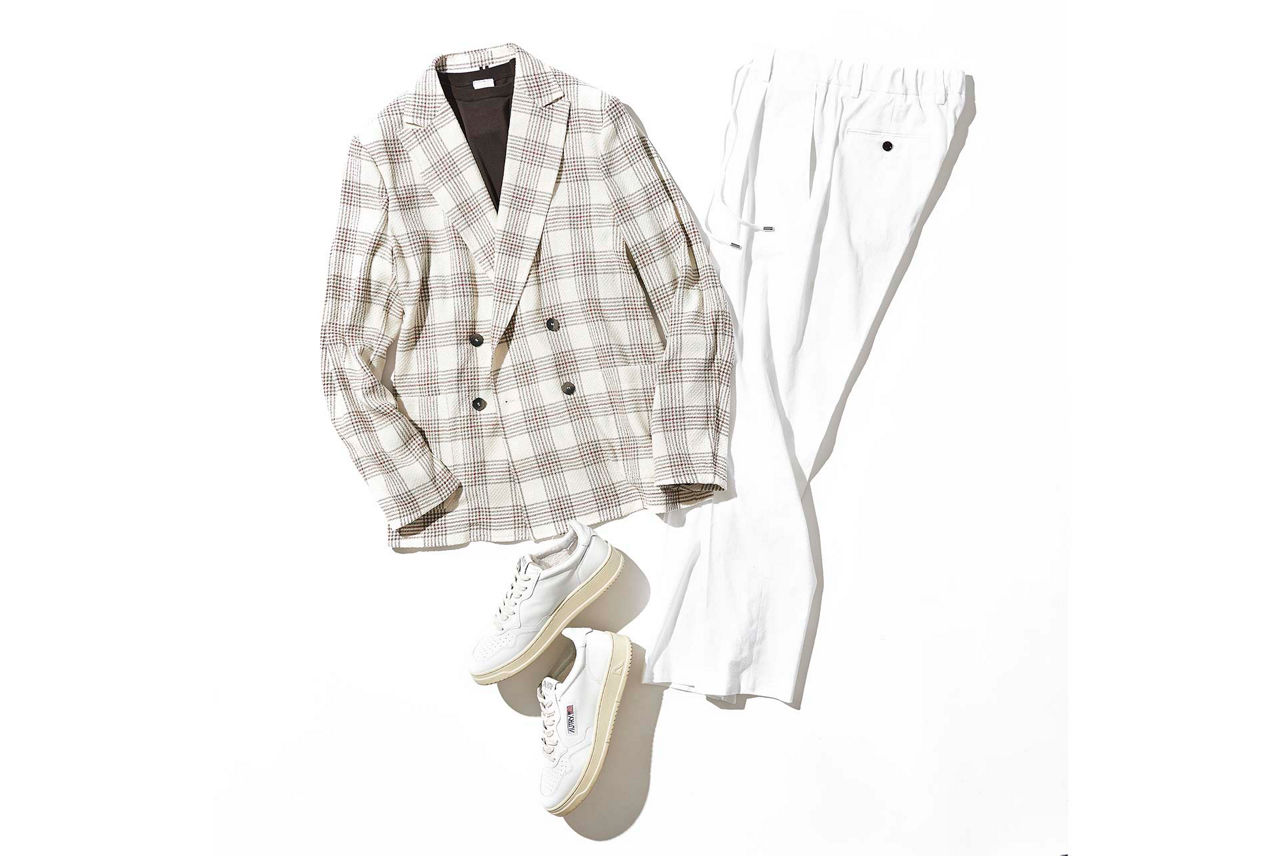 ジャケット¥212,300/ムーレー、カットソー¥14,080/ヴィルーム(ともにコロネット TEL:03-5216-6521)、パンツ¥46,200/ラルディーニ(トヨダトレーディング プレスルーム TEL:03-5350-5567)、スニーカー/スタイリスト私物