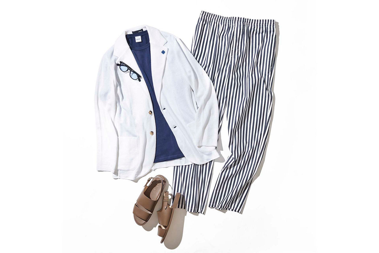 ジャケット¥93,500/ラルディーニ、ニット¥37,400、ストライプパンツ¥39,600/ともにアスペジ(すべてトヨダトレーディング プレスルーム TEL:03-5350-5567)、サンダル¥48,400/フット ザ コーチャー(トラディショナル ウェザーウェア ルミネ有楽町店 TEL:03-6810-0388)、サングラス¥64,900/アイヴァン 7285(アイヴァン 7285 トウキョウ TEL:03-3409-7285)