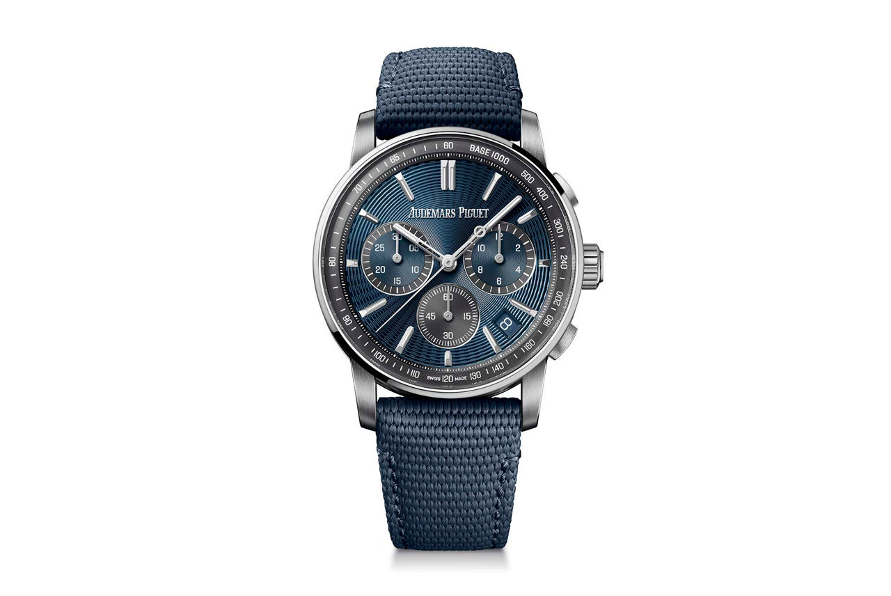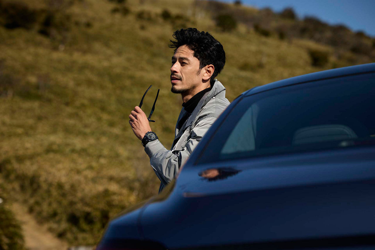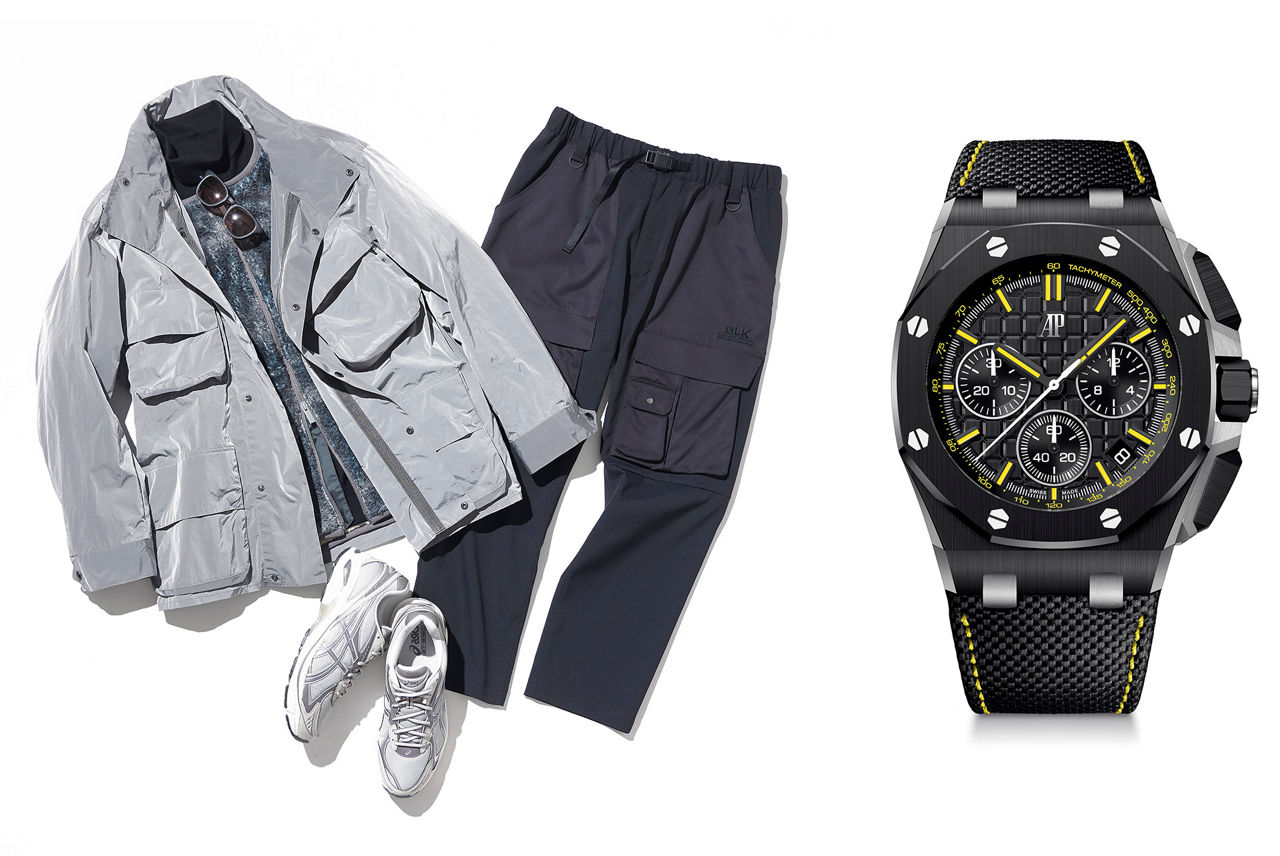 圧倒的な存在感を放つ「ロイヤル オーク オフショア」を腕元に、ラグジュアリーセダンのハンドルを握り、ワインディングロードを駆け抜ける。ブラックセラミックのケースとベゼルに、イエローのマーカーとイエローのステッチが効いたストラップが、スポーティな印象を与えてくれる。旅を最高の移動時間にする"相棒"とともに。