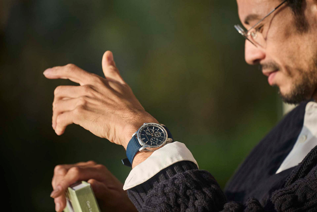 西日が差し込みはじめる夕暮れどき、CODE 11.59とともにひとりきりの時間を満喫。リビングルームでビジュアルブックに感化され、ウッドデッキのテラスで雄大な景色に癒される。波模様をモチーフに、繊細にスタンプ加工が施されたブルーダイヤルが特徴となるCODE 11.59の最新モデルが、ゆっくりと時を刻んでくれる。
