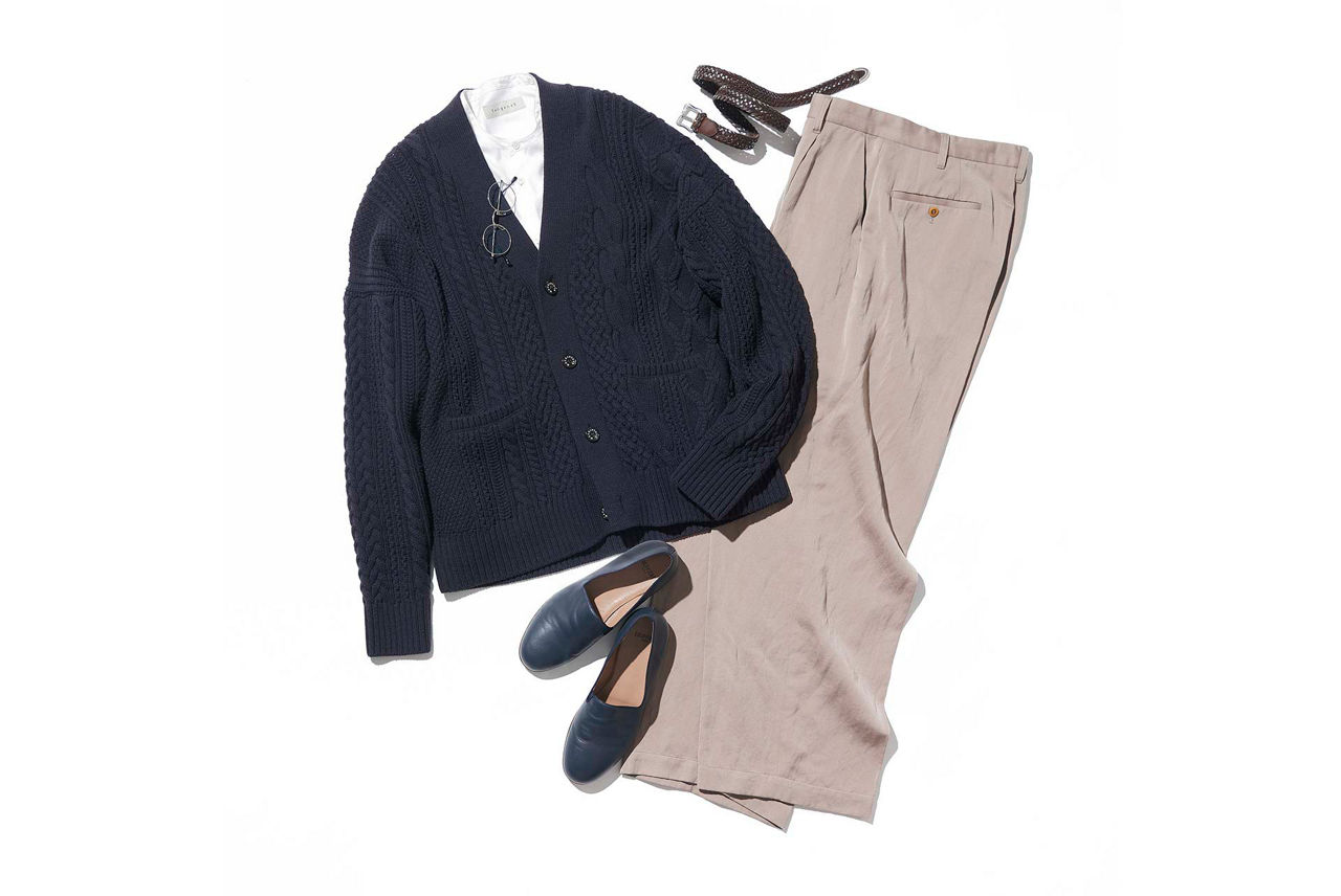 カーディガン¥64,900/マッキントッシュ クラフテッド バイ バトナー(マッキントッシュ ギンザシックス店 TEL:03-6264-5994)、シャツ¥24,200/タンジェネット(タンジェネット mitsuruyoshiya@gmail.com)、ベルト¥38,500/J&M デヴィッドソン(J&M デヴィッドソン カスタマーセンター TEL:03-6809-2422)、パンツ¥53,900/エイク(エイクショップ info@eyck-tokyo.jp)、メガネ、シューズ/スタイリスト私物