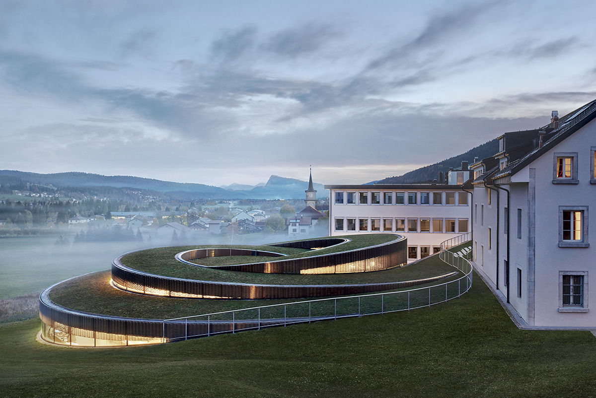 オーデマ ピゲ生誕の地、スイスのジュウ渓谷にオープンした新しいミュージアム。デンマークの建築事務所、BIG(ビャルケ・インゲルス・グループ)設計によるスパイラル状のパビリオンは、何世紀にもわたり時計師にインスピレーションを与えてきた周囲の景観と違和感なくマッチする。