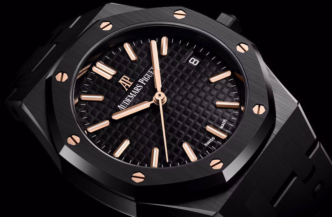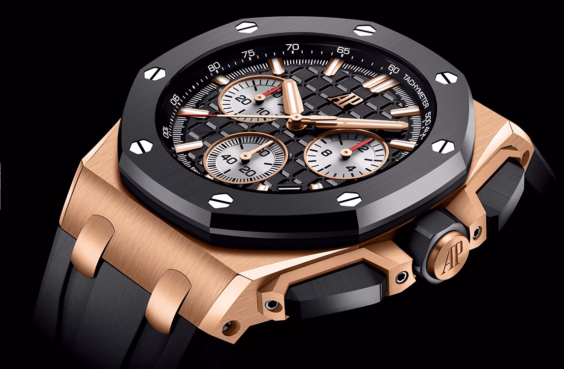 スモークグレーダイヤルにブラックセラミックのミドルケースがマッチ。18Kピンクゴールドのケースおよびパーツと相まって、艶やかさを醸し出す。
