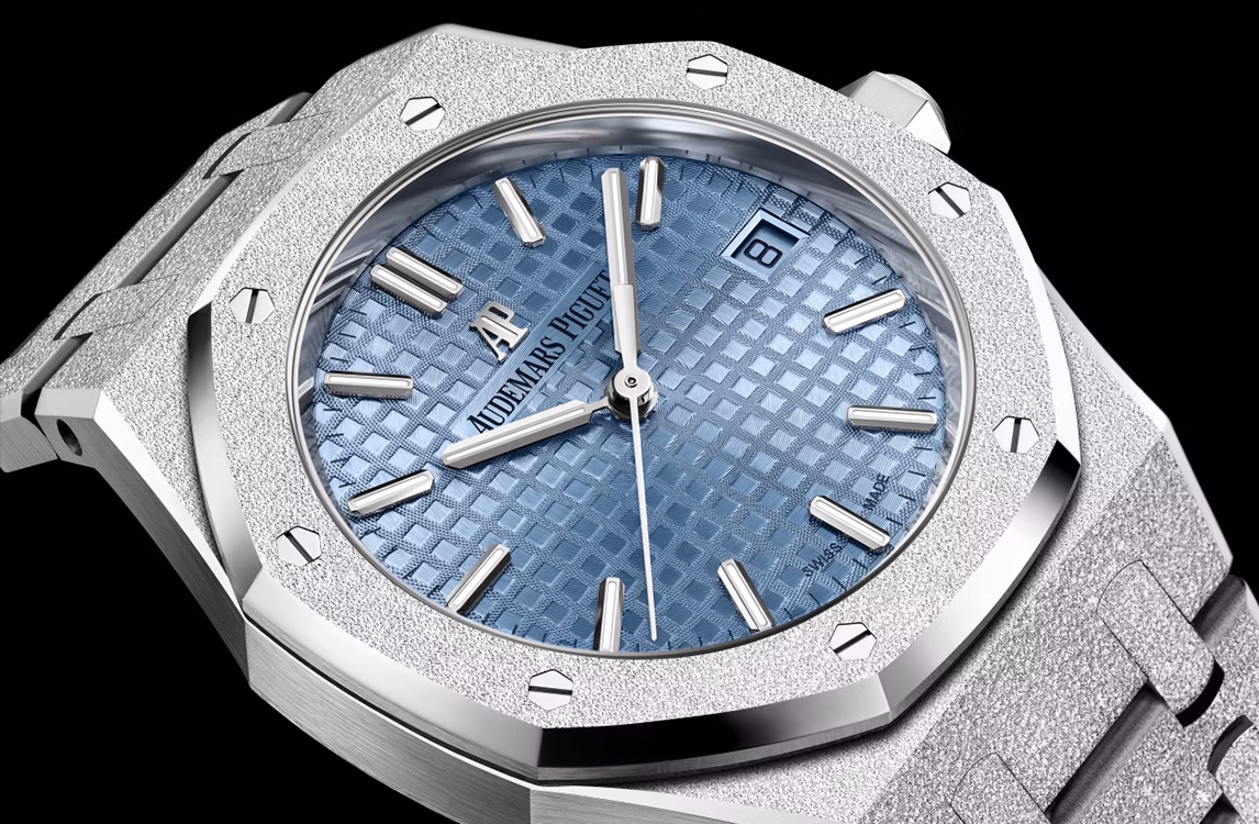 サンバースト装飾のスモークブルーがダイヤルいっぱいに堪能できる3針モデル。18Kホワイトゴールドの輝きと相まって海面にきらめく太陽光線のよう。