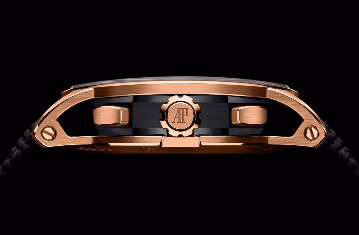 ラバー加工が施されたブラックストラップ、18Kピンクゴールド製ピンバックル。