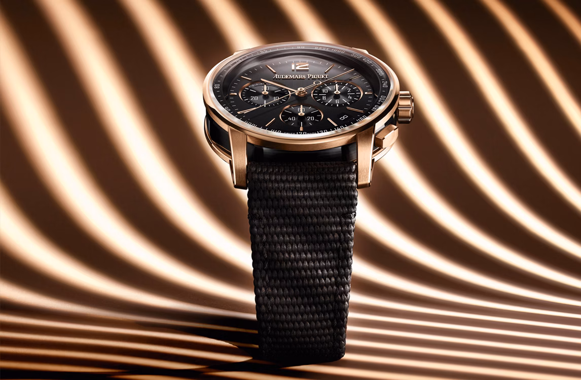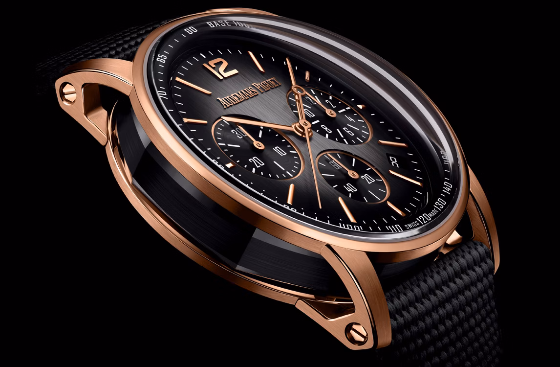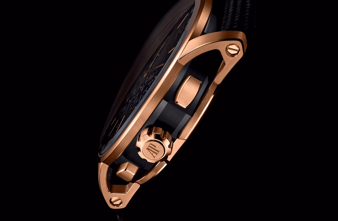 バイカラーのコンテンポラリーなタイムピース、18Kピンクゴールドとブラックセラミックのケース、スモークグレーのダイヤルはヘアライン仕上げ。