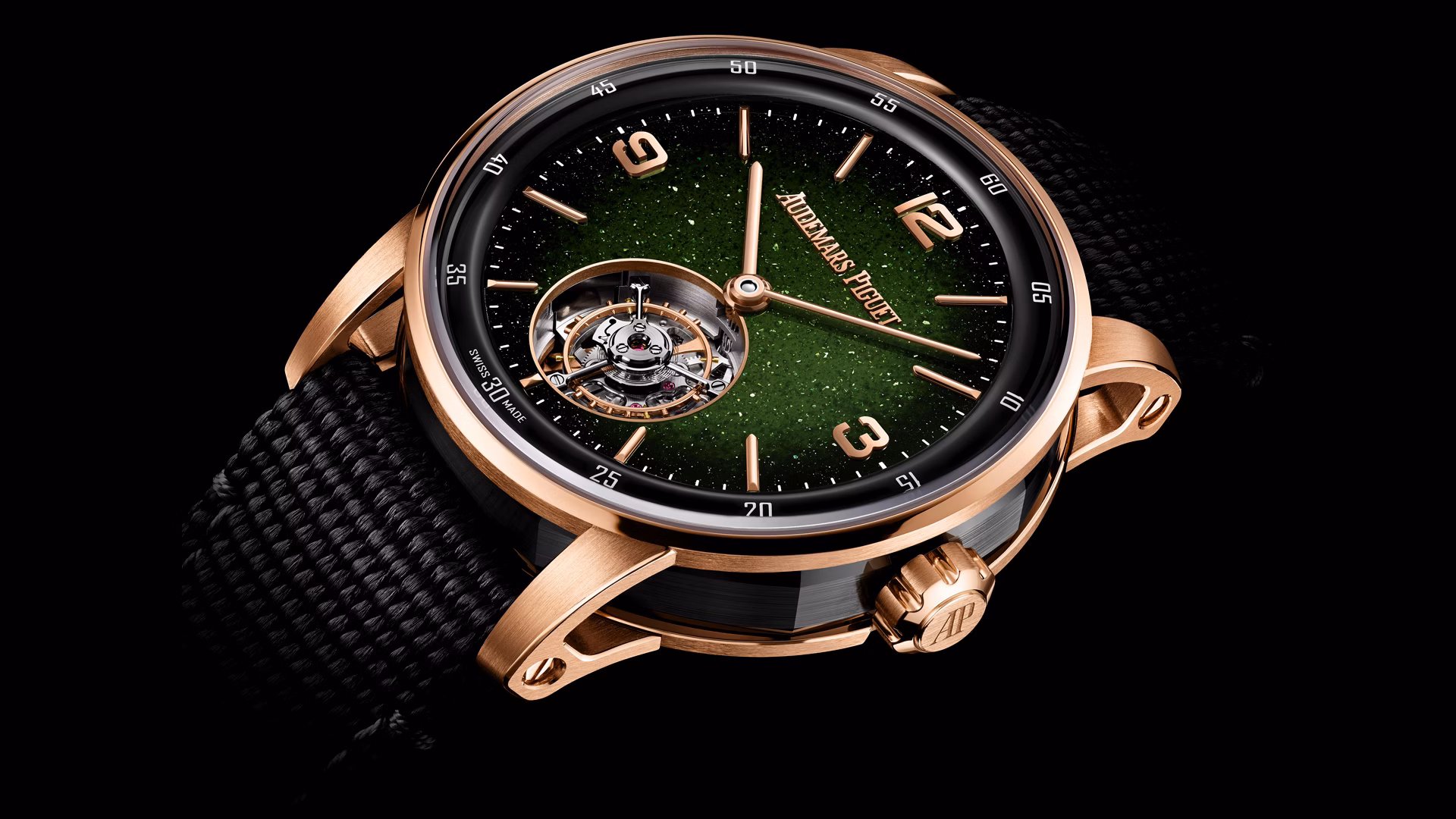 ピンクゴールドとブラックセラミックのフライングトゥールビヨン タイムピースに、スモークグリーン エナメル アヴェンチュリンが幻想的な雰囲気を与えます。