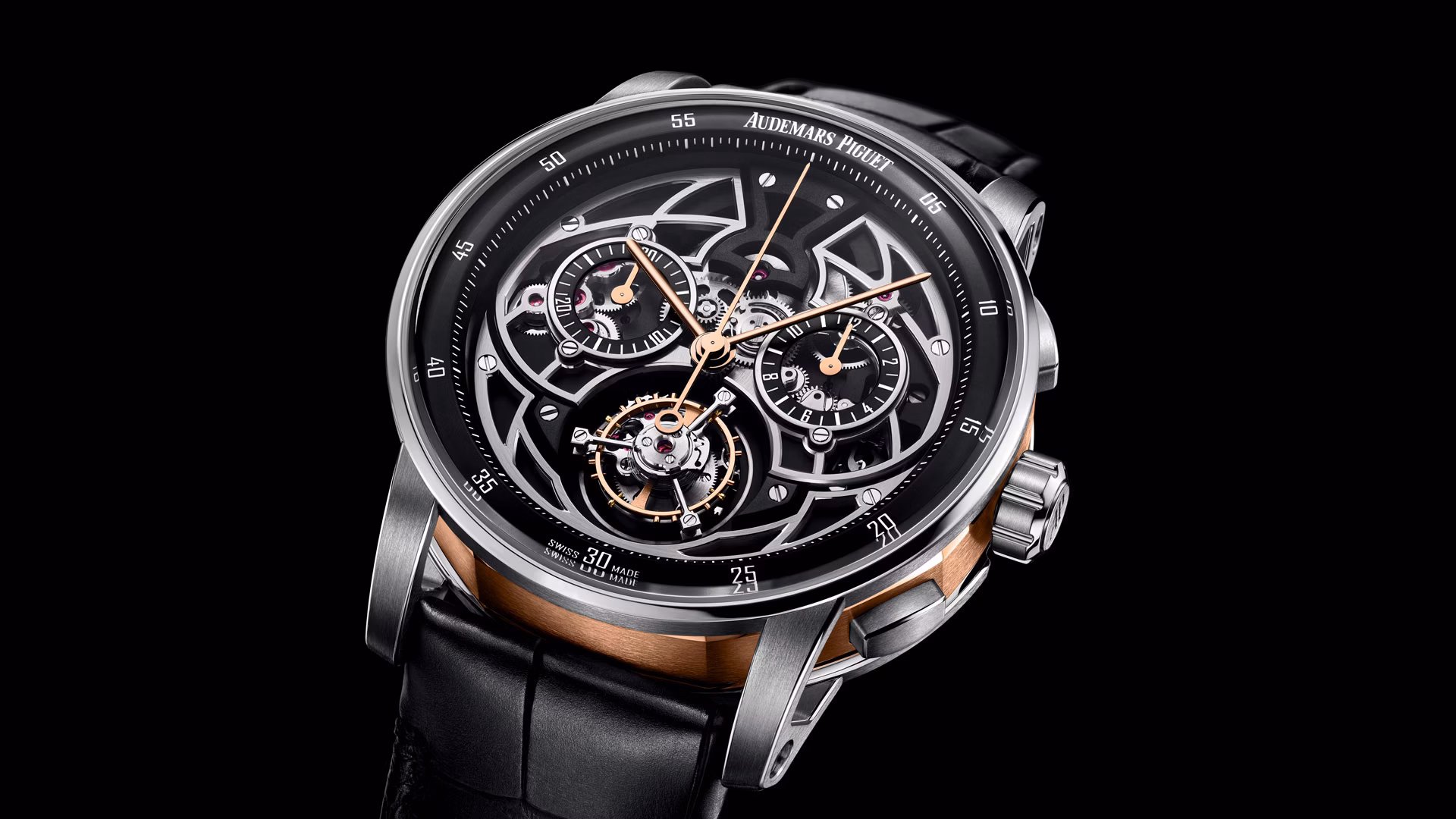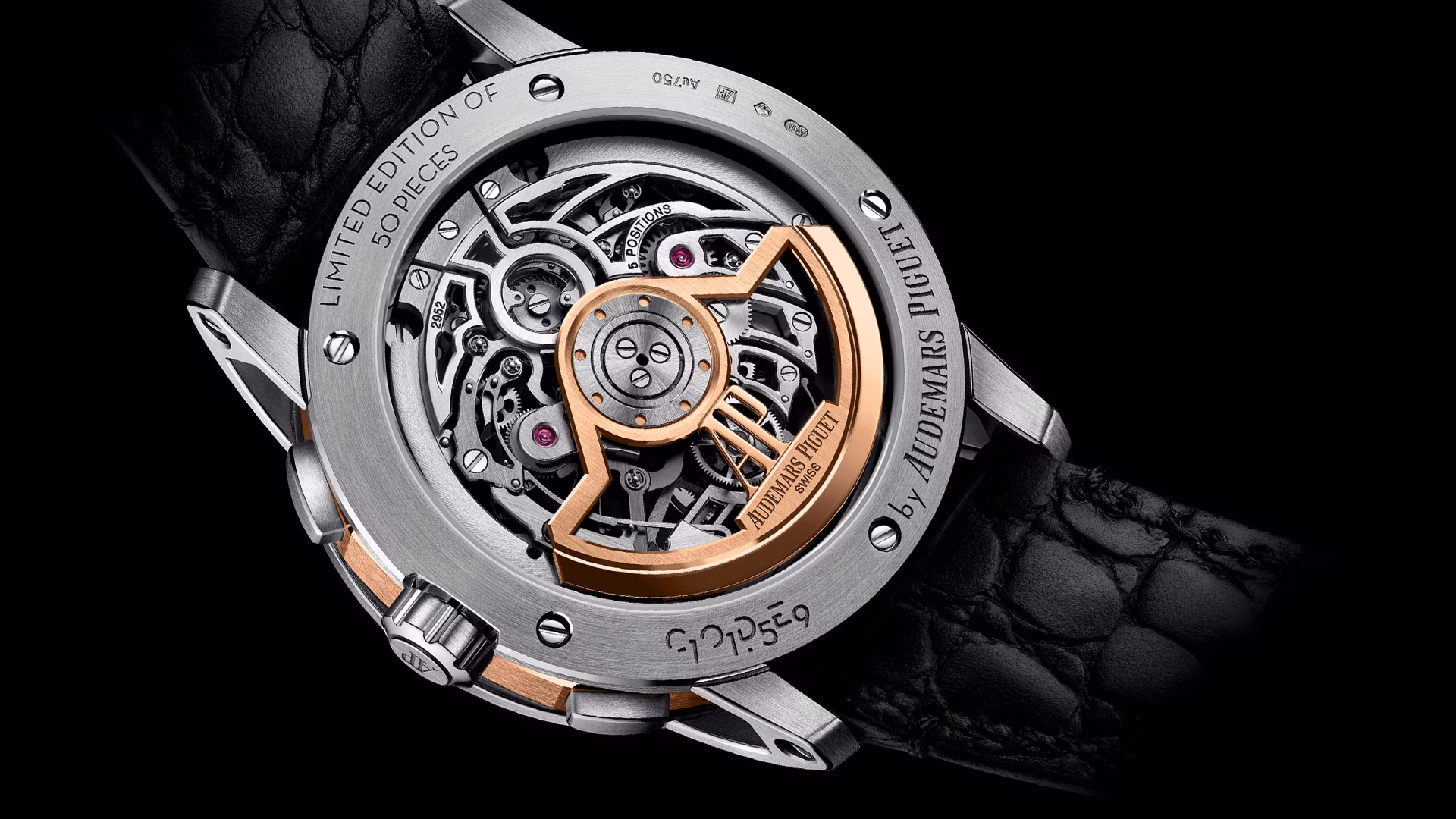 50本限定モデル、18Kホワイトゴールドとピンクゴールドのバイカラーケースを彩るアーキテクチャルなブラックとピンクゴールドカラーのダイヤル