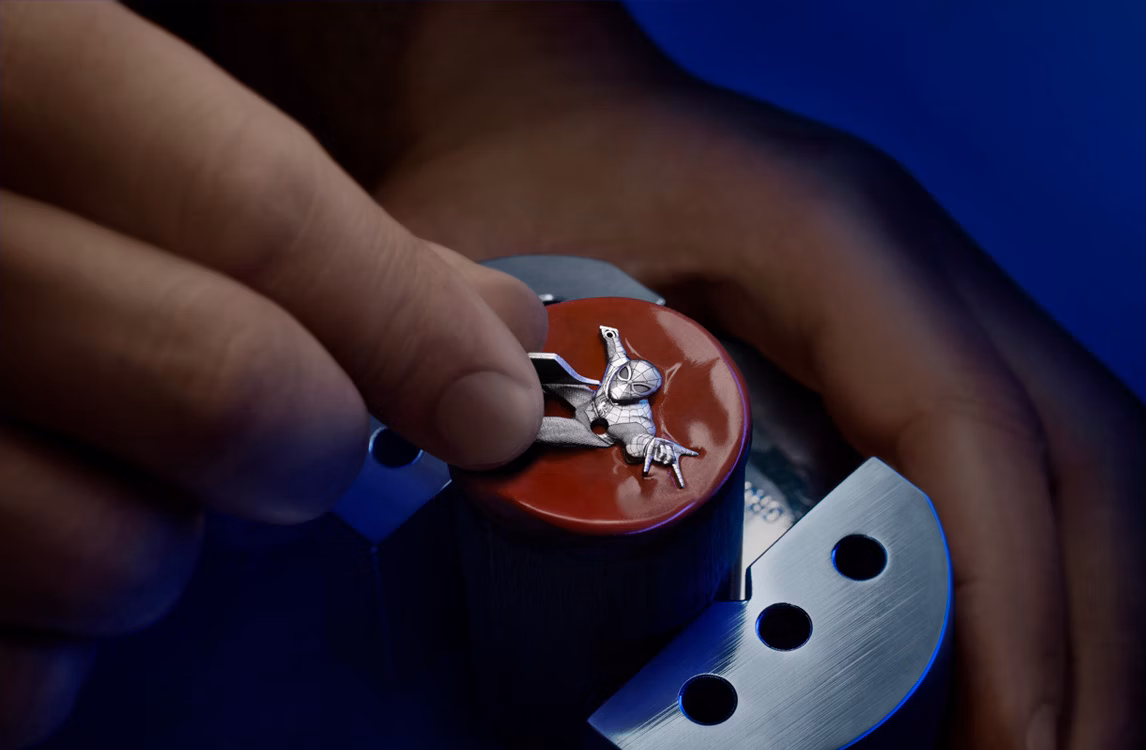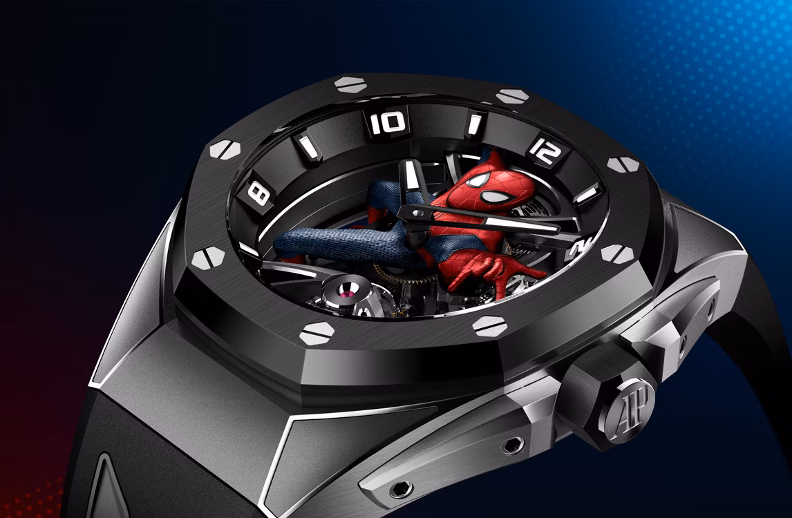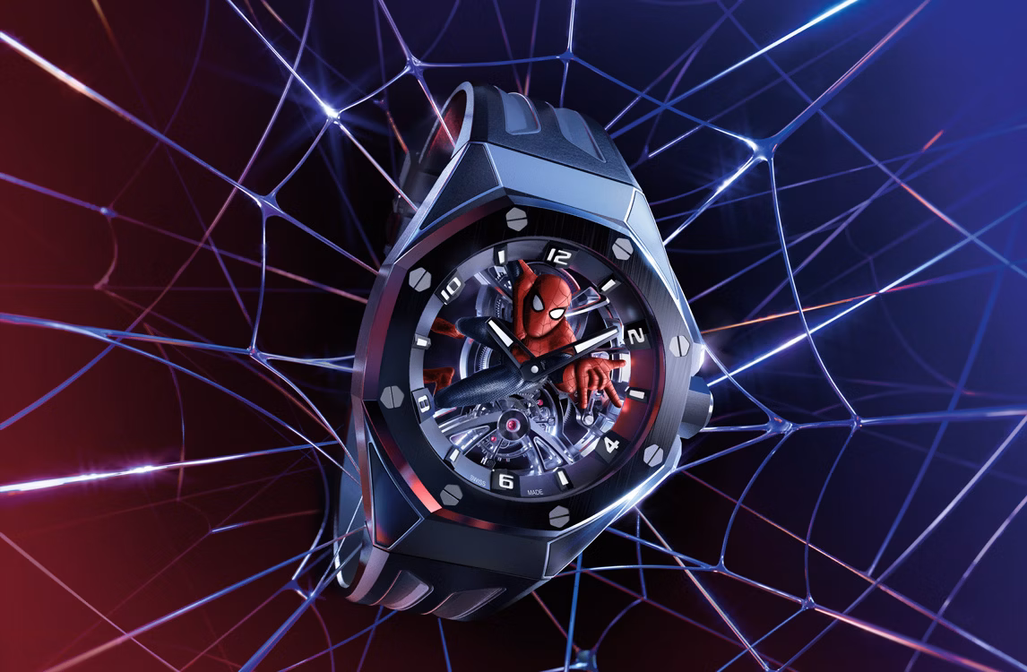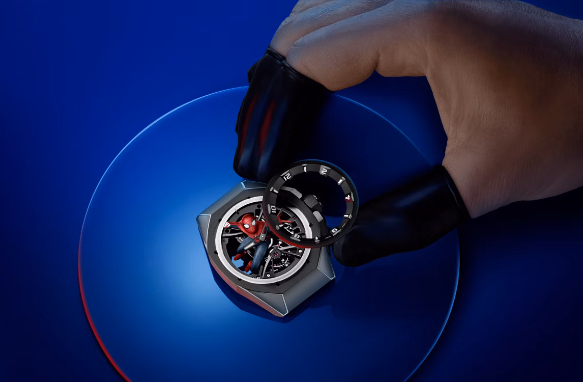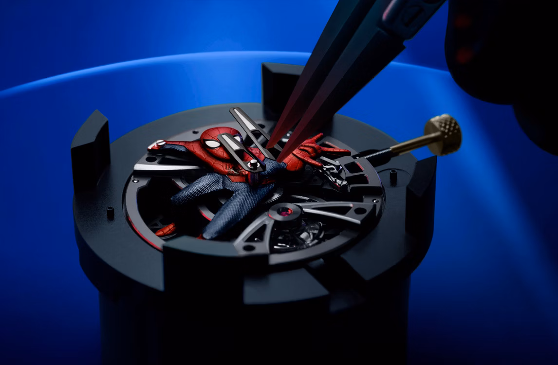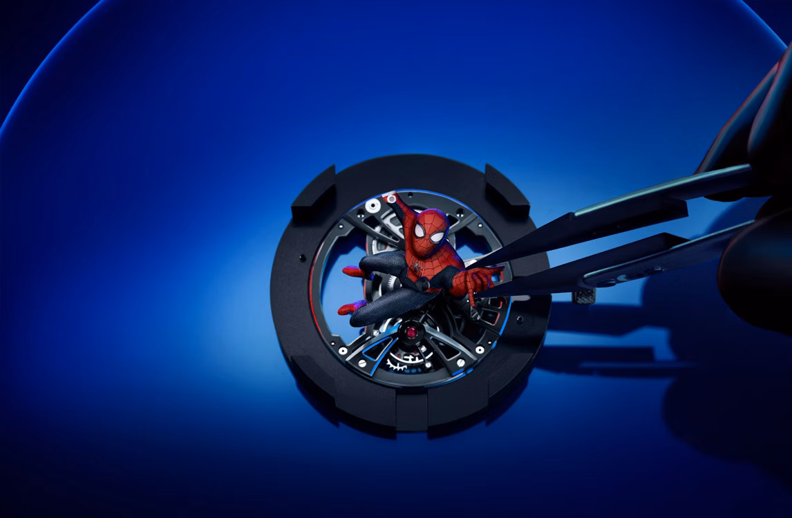 スケルトン化を進めたこのマーベルとのコラボ第二弾はスパイダーマンへのトリビュート。スパイダーマンがトゥールビヨンのメカニズムの中を通り抜けダイヤルにぶら下がっているように見えます。