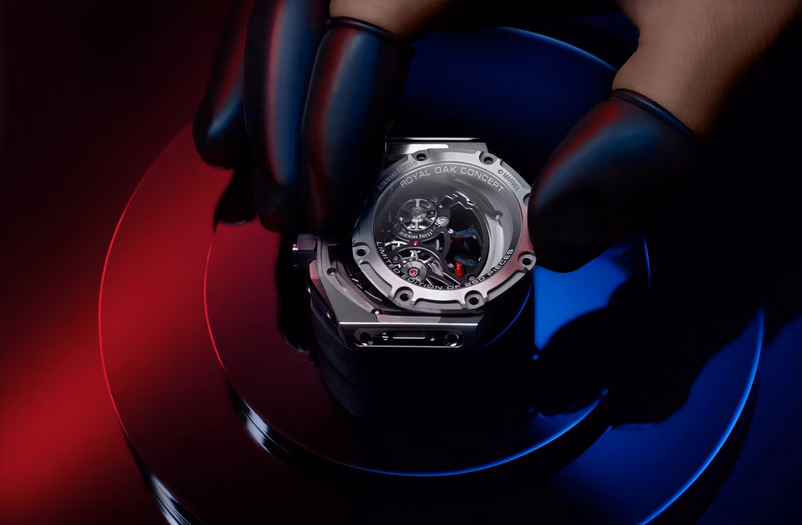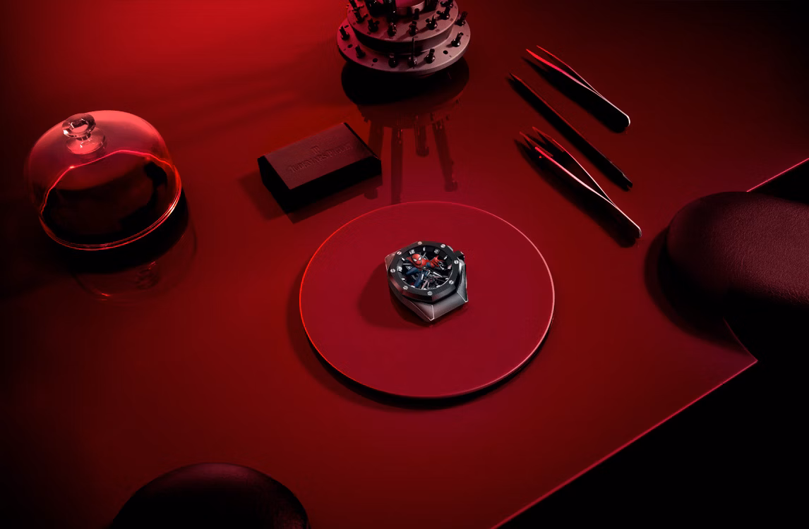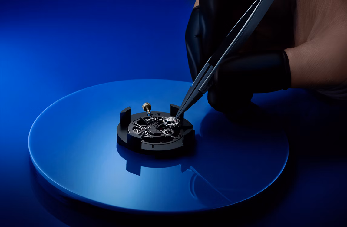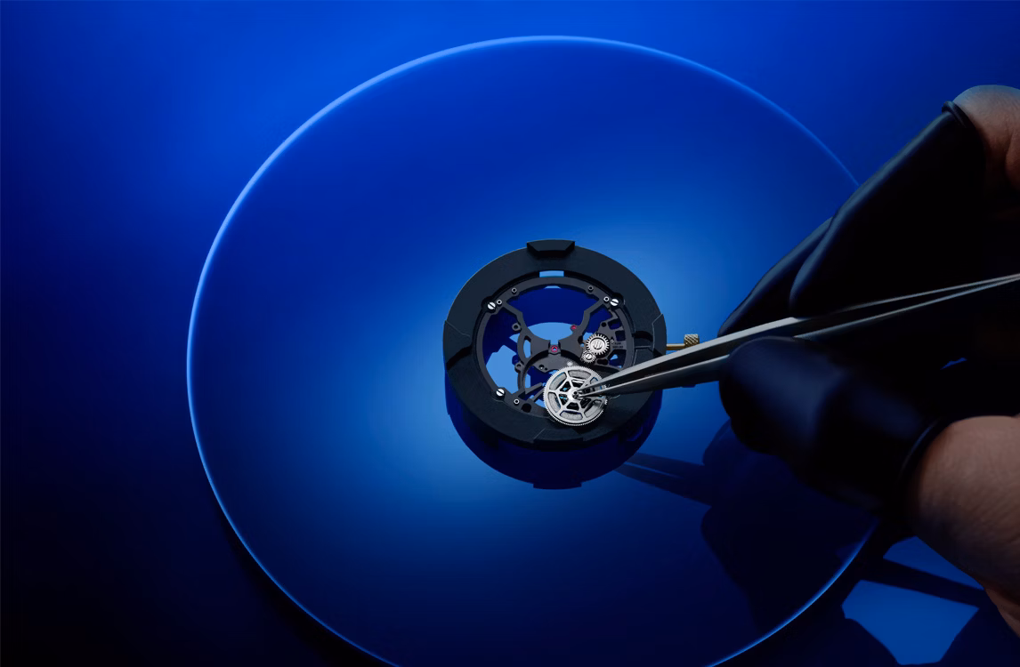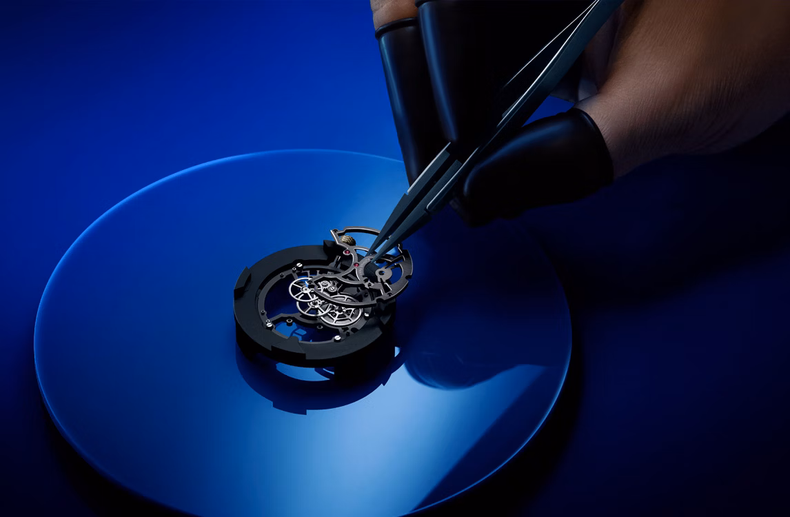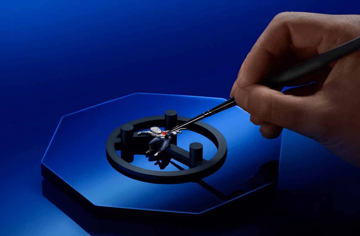 スケルトン化を進めたこのマーベルとのコラボ第二弾はスパイダーマンへのトリビュート。スパイダーマンがトゥールビヨンのメカニズムの中を通り抜けダイヤルにぶら下がっているように見えます。