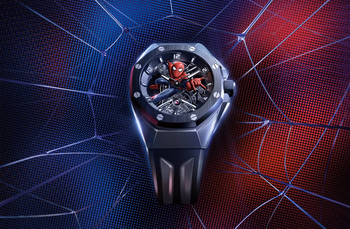 オープンワークダイヤル、「スパイダーマン」のキャラクター、蓄光処理を施したホワイトゴールドのアワーマーカーと針。
