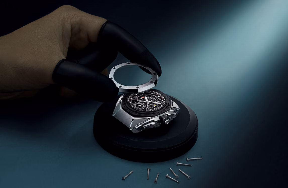 チタンケースとベゼル、反射防止加工サファイアクリスタルとケースバック、ブラックセラミックプッシュボタンとネジ込み式リューズ。